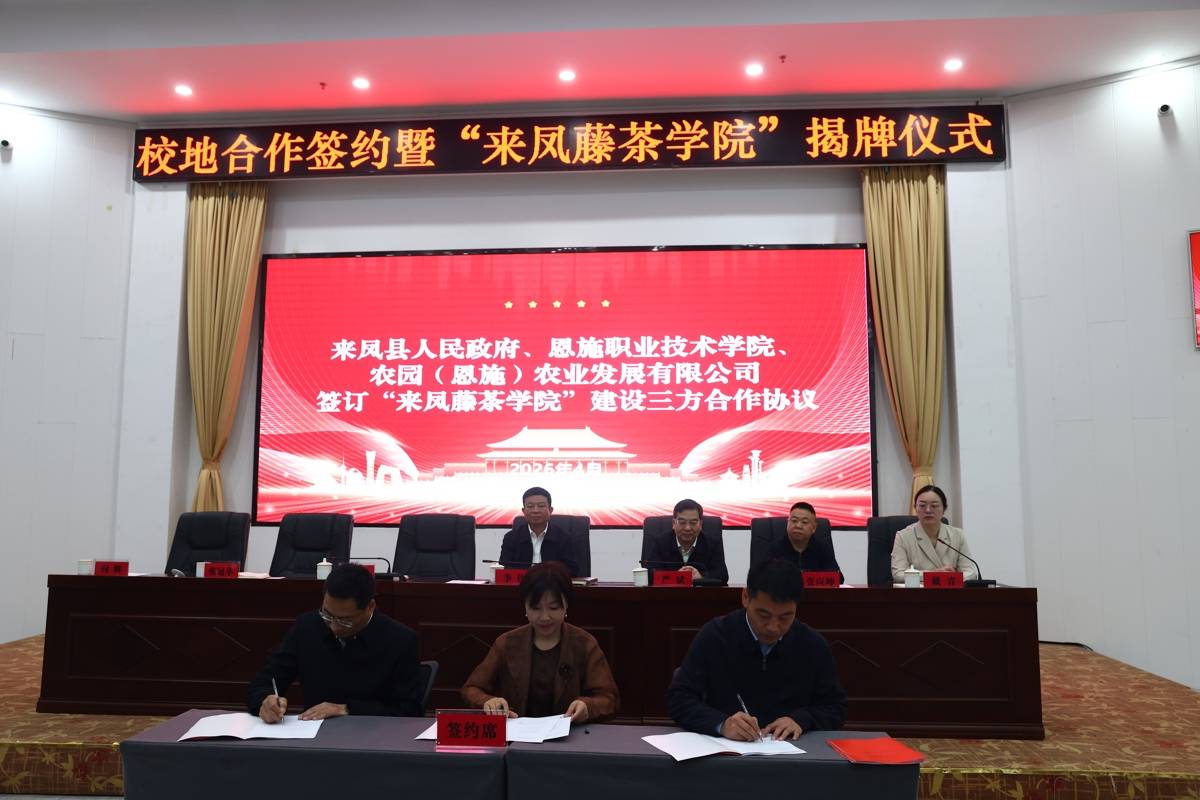 来凤藤茶学院由来凤县人民政府、恩施职业技术学院与农园(恩施)农业发展有限公司三方共建。活动现场,政校企三方共同为藤茶学院揭牌,签署合作办学协议,明确各方职责与合作方向。
