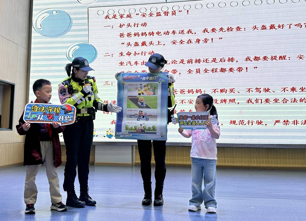 4月20日下午,武汉市武昌区交通管理大队汉警快骑队员走进白鹭街小学,为一、二年级200余名学生送上一堂生动鲜活的交通安全课。现场,李爱琳警官用实景案例、趣味互动、现场问答,把安全知识讲得看得见、听得懂、记得牢。“我一定要爸爸妈妈给我戴安全头盔!”一年级同学听完后纷纷表示。
