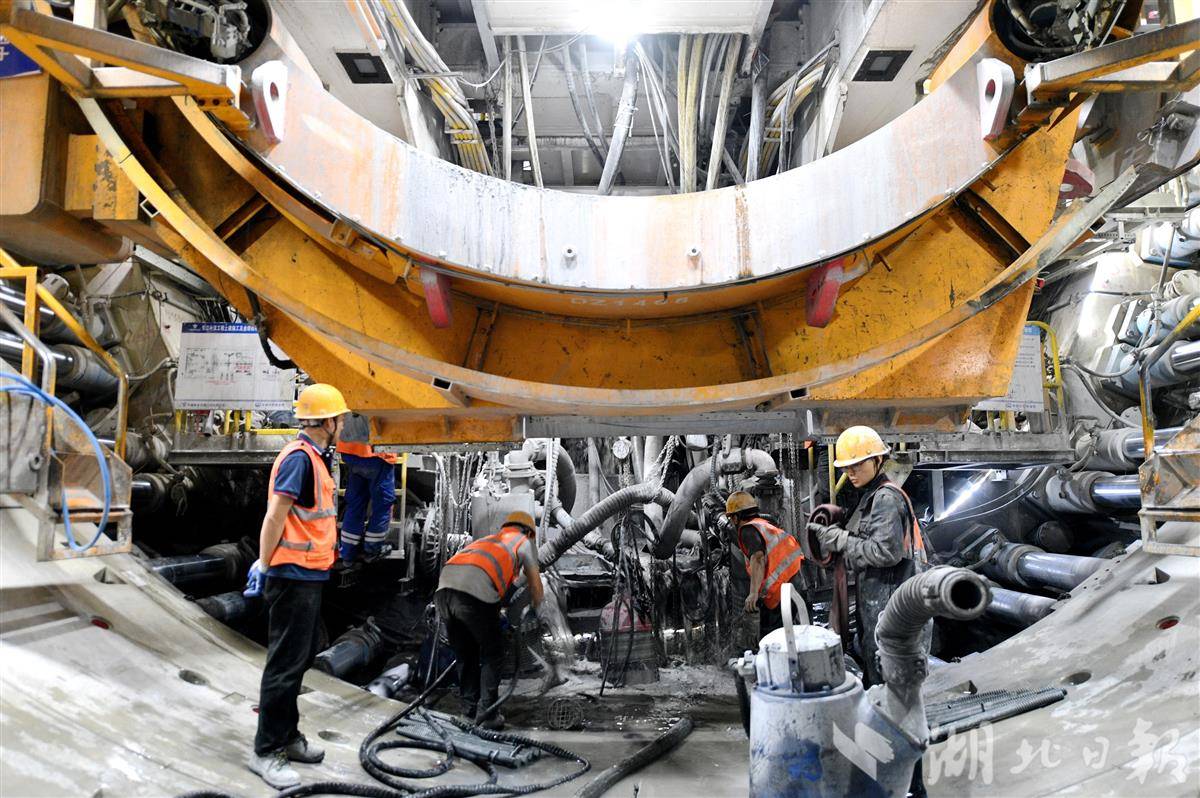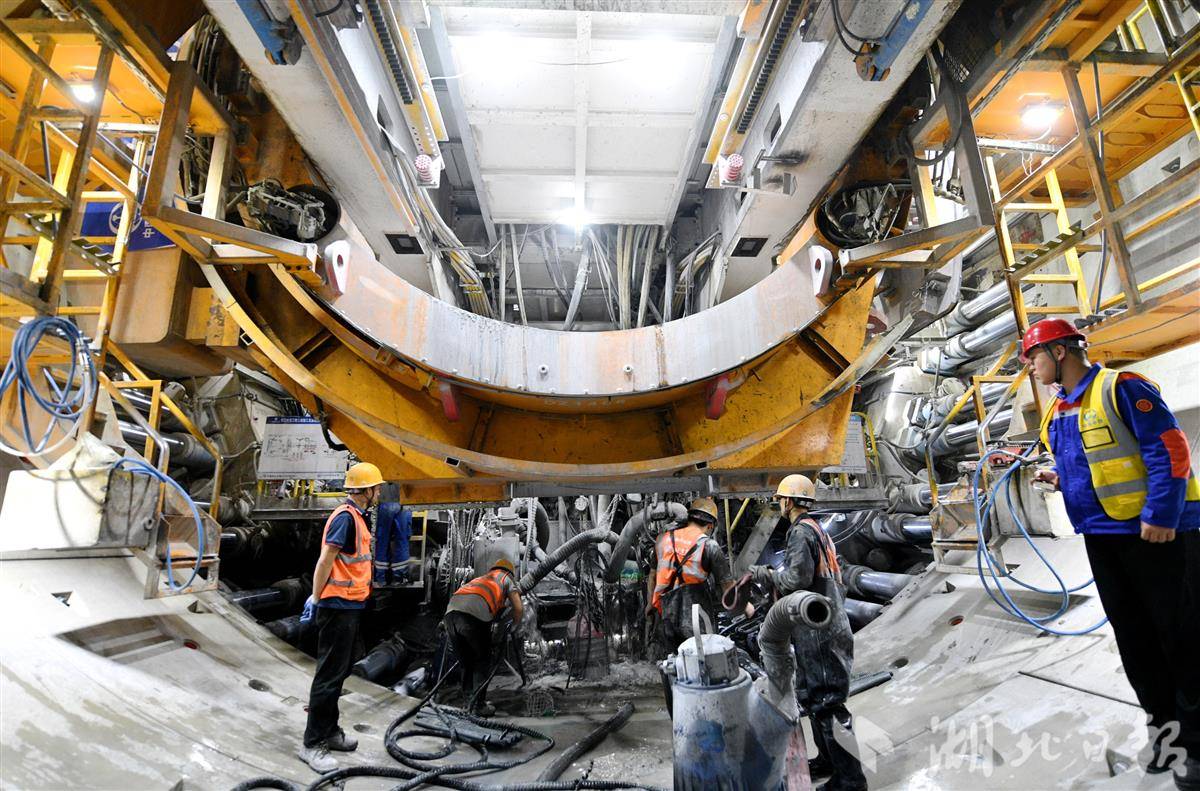工人在引江补汉工程5标11号检修交通洞输水主隧洞“江汉云梦号”TBM施工现场加紧施工。
