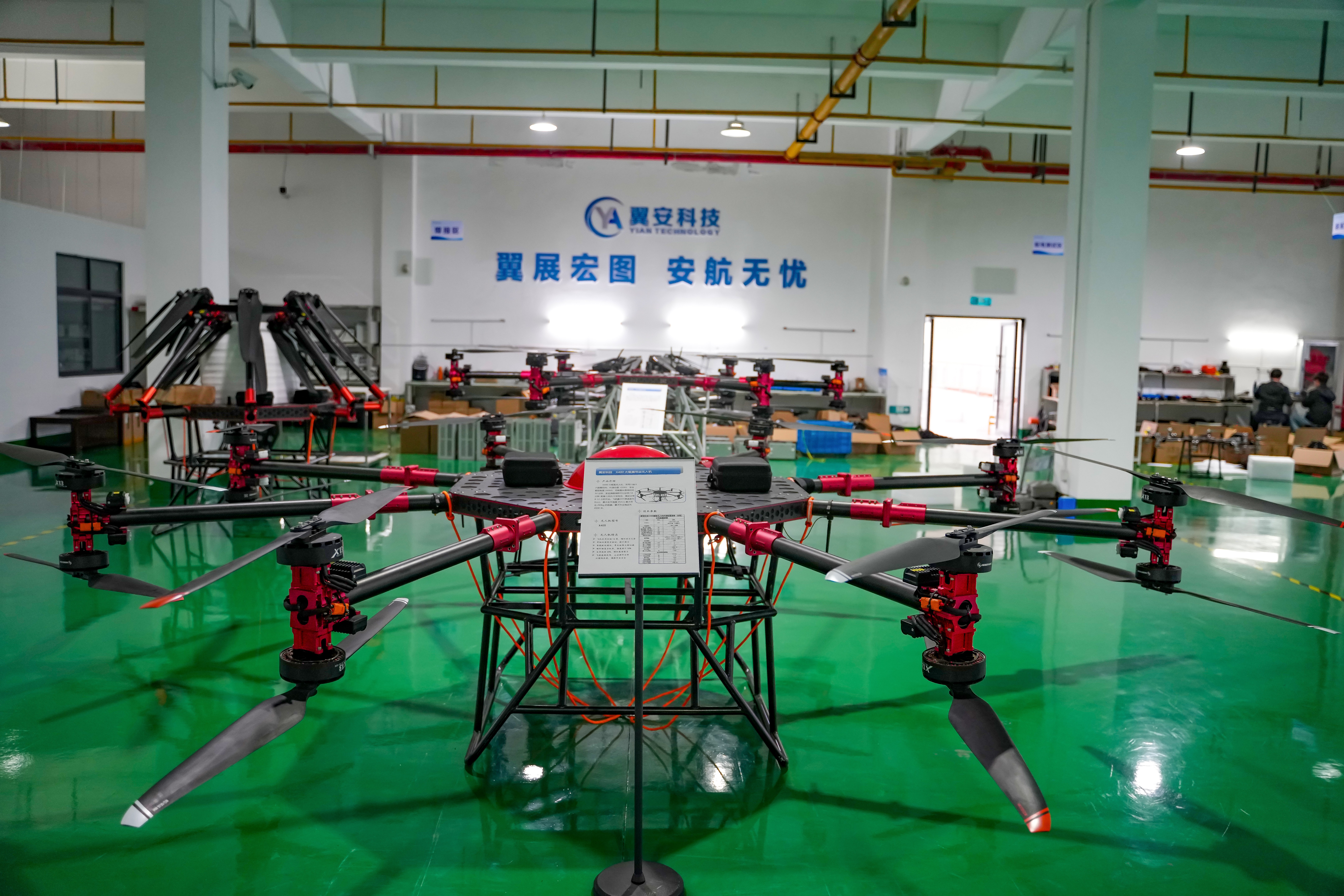翼安科技车间内,十多台重型无人机正在组装。(记者 郭启超 摄)