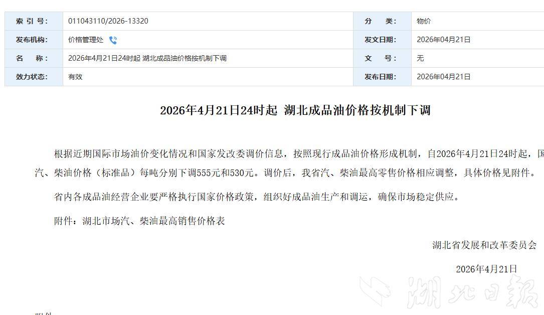 湖北日报讯(记者谢慧敏)今年首次油价下调来了!从省发改委价格管理处获悉,根据近期国际市场油价变化情况和国家发改委调价信息,按照现行成品油价格形成机制,自2026年4月21日24时起,国内汽、柴油价格(标准品)每吨分别下调555元和530元。调价后,我省汽、柴油最高零售价格相应调整,省内92号汽油、95号汽油、0号柴油每升分别下调0.45元、0.48元、0.46元。
