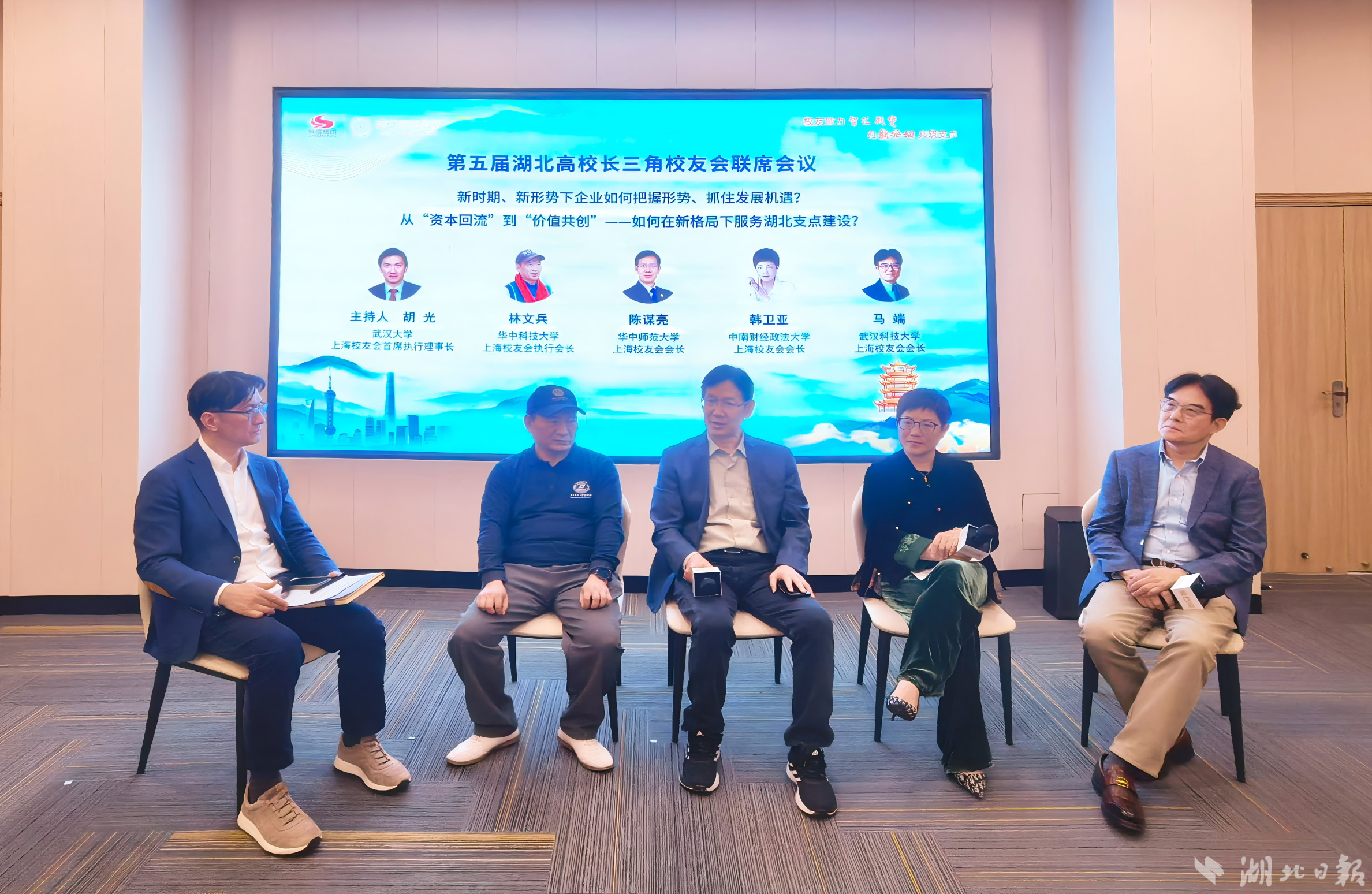会上,湖北大学上海校友会会长、上海致盛集团董事长张润斌为大家分享了企业的发展历程、发展经验、对湖北发展的印象以及回湖北投资的感受。武汉大学校友会首席执行理事长胡光、华中科技大学校友会执行会长林文兵、华中师范大学校友会会长陈谋亮、中南财经政法大学校友会会长韩卫亚、武汉科技大学校友会会长马端围绕“新时期、新形势下企业如何把握形势、抓住发展机遇”和“从‘资本回流’到‘价值共创’——如何在新格局下服务湖北支点建设?”展开讨论交流,分析当前发展形势,探讨沪鄂联动机遇,为湖北支点建设建言献策。刘建平校长为大家介绍了湖北校友工作促进会的工作职能、工作内容以及湖北的发展特色,欢迎各位校友回归湖北。大家纷纷表示,湖北战略机遇叠加、产业升级强劲、科教资源富集、营商环境优良,是大家魂牵梦萦的故乡或者第二故乡,校友会将充分发挥校友在科技、资本、产业等方面的优势,当好湖北招商的“宣传员”和“联络员”,推动更多优质项目、高端人才、创新要素向湖北集聚。