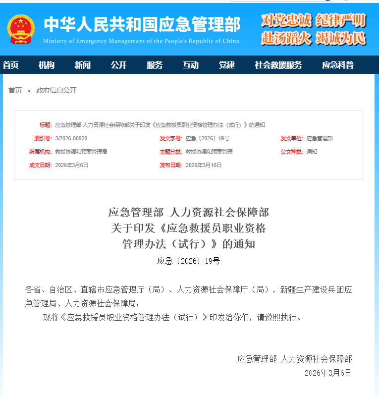 湖北日报讯(记者王成龙)为规范应急救援员职业资格管理,提高专业应急救援人员职业能力、水平和素质,保障应急救援工作科学有序开展,近日,应急管理部会同人力资源社会保障部联合印发《应急救援员职业资格管理办法(试行)》(下文简称《办法》),自2026年9月1日起施行。