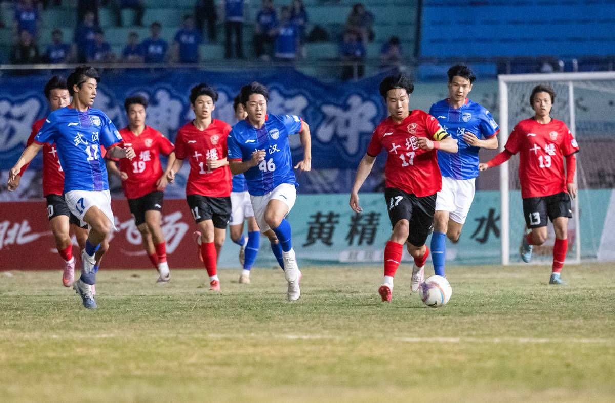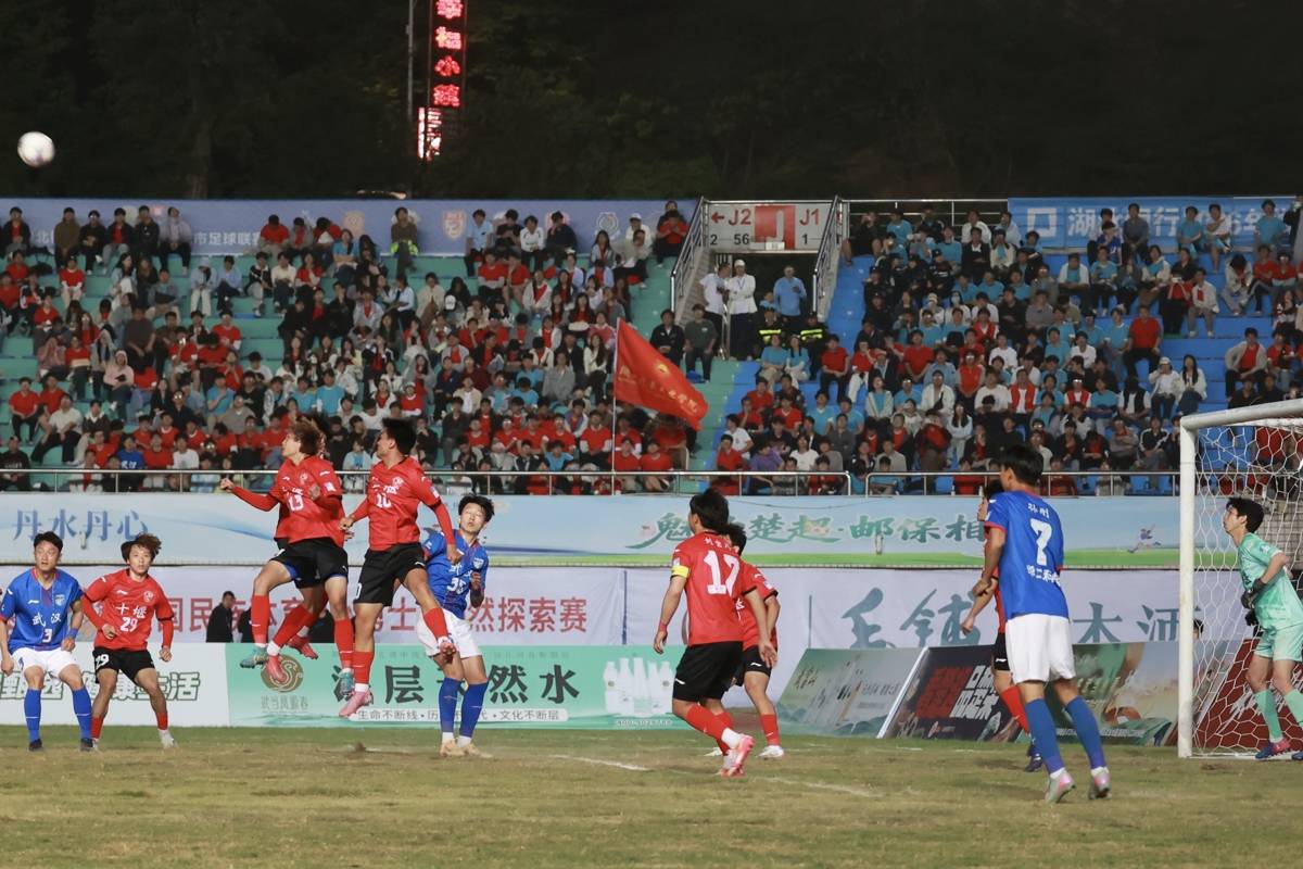 易边再战,第49分钟,“武汉华工科技”队3号球员熊飞将比分扩大至2:0。困境之下,“十堰武当”队放手一搏。第53分钟,14号球员岳广鑫抓住角球机会扳回一城,打入“十堰武当”队“楚超”首球,将比分改写为1:2。看台上瞬间沸腾,“十堰加油”的呐喊声响彻全场。