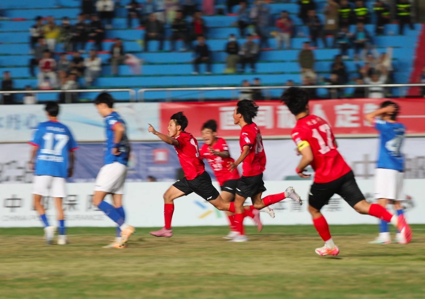 身着红色比赛服的“十堰武当”队,庆祝“楚超”首个进球。(湖北日报全媒记者 柯皓 摄)