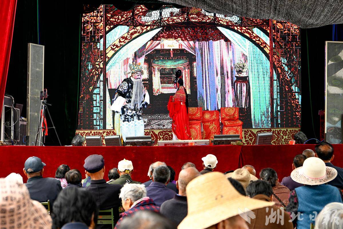 4月21日,黄冈市浠水县竹瓦镇渡槽村,戏曲演员为村民表演楚剧。为丰富农村地区群众精神文化生活,近年来,浠水县文化部门积极开展“送戏下乡 文化惠民”活动,将一场场精彩的戏曲节目送到乡镇村组,让广大农民在家门口就能乐享“文化大餐”,受到群众欢迎。(视界网 王江 摄)