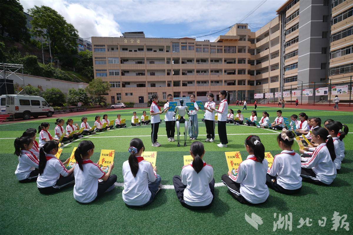 4月22日,在巴东县信陵镇光明小学,学生正与机器人一起阅读、一起对话。