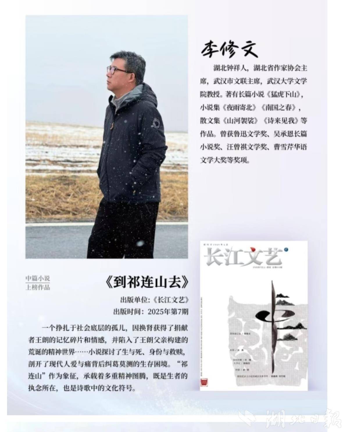 湖北日报讯(记者农新瑜、通讯员沈作) 近日,由《小说选刊》主办的首届小说年度风云榜正式发布,湖北三位作家作品分别入选榜单,分别为湖北省作协主席、武汉市文联主席李修文的中篇小说《到祁连山去》,武汉市文联专业作家班宇的短篇小说《星期天大街》,以及武汉市文联专业作家陈春成的短篇小说《山石》。
