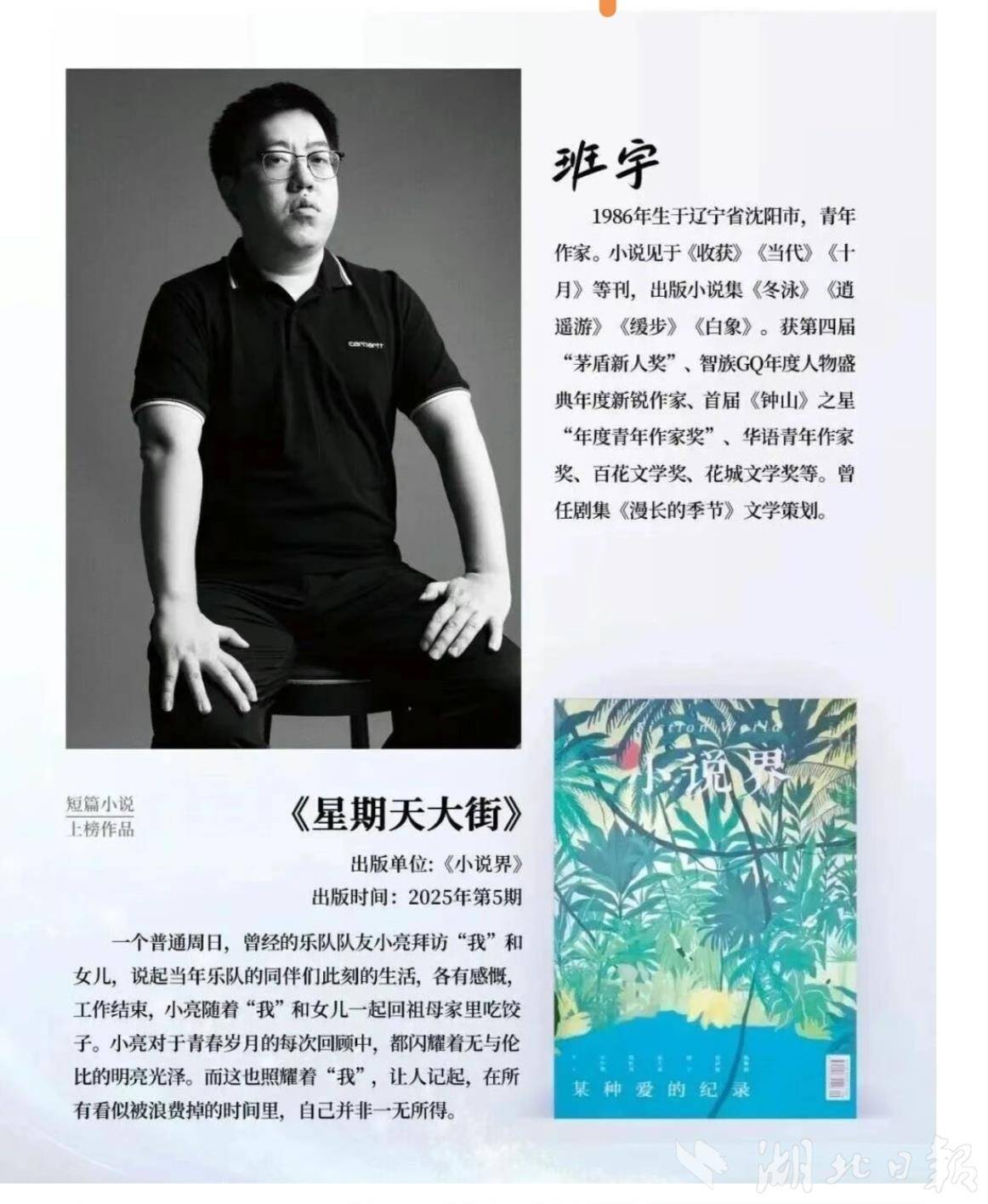 班宇的《星期天大街》发表于《小说界》2025年第5期。小说围绕一个普通周日展开,曾经的乐队队友小亮到访,与“我”和女儿谈起过往同伴的当下生活。授奖词认为该作品“展现了自由即兴的魅力”。