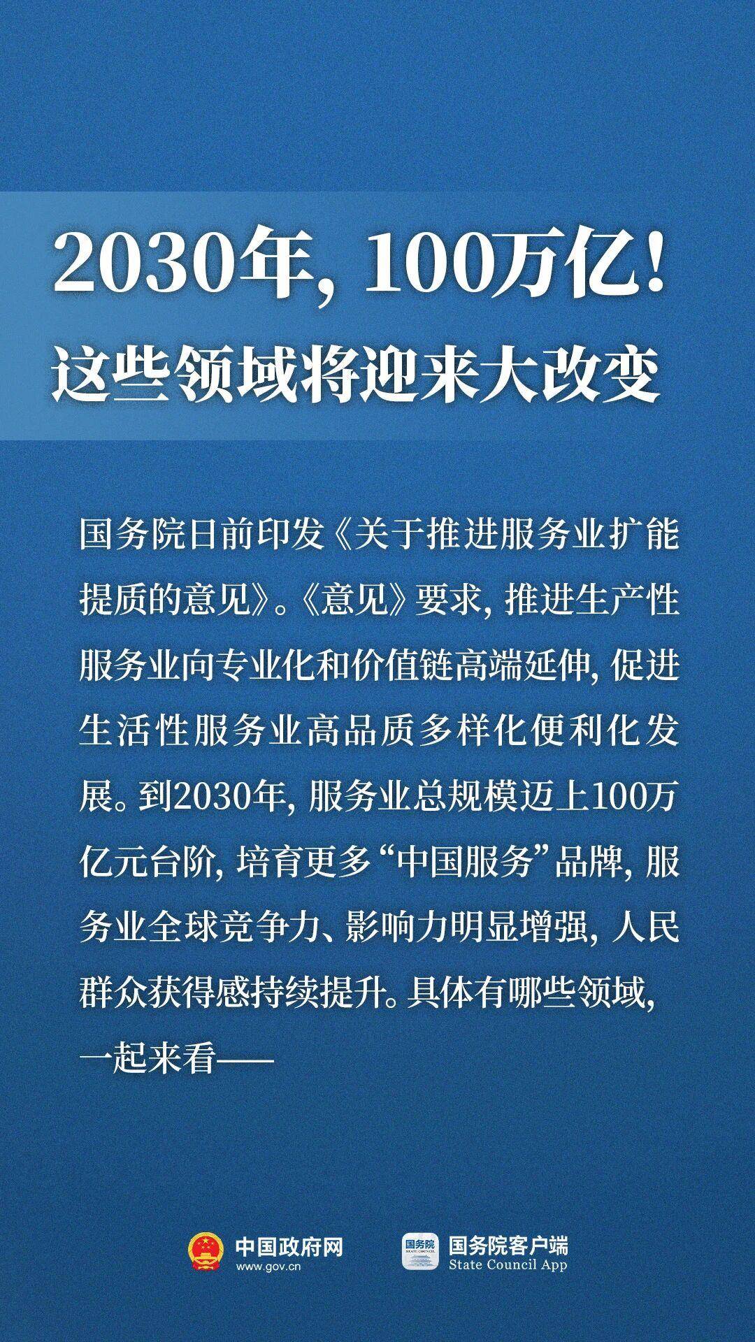 国务院日前印发《关于推进服务业扩能提质的意见》。《意见》明确,到2030年,服务业总规模迈上100万亿元台阶,培育更多“中国服务”品牌,服务业全球竞争力、影响力明显增强,人民群众获得感持续提升。