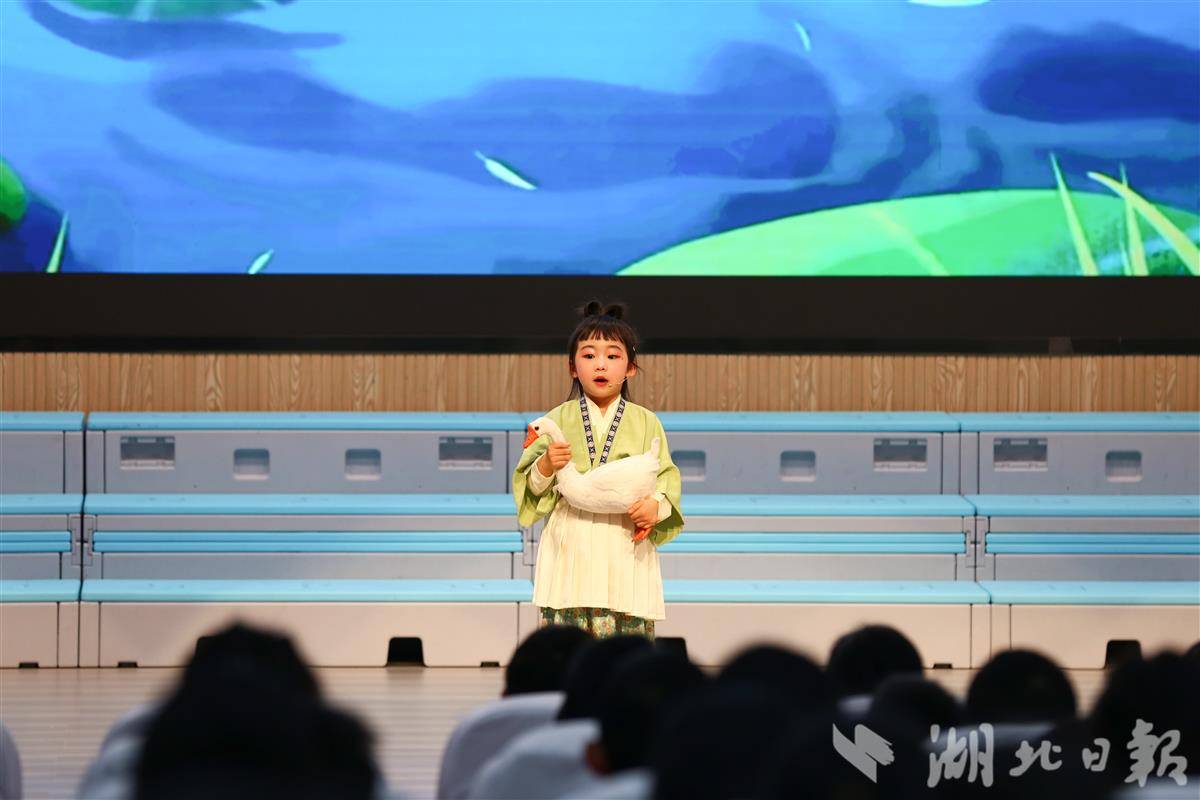 这场持续两小时的活动设计了几个创新环节:《咏鹅》的孩子怀抱白鹅,身着古装,原景重现;亲子诵读环节,一对母子表演古诗新唱《草》,三组家庭朗诵《少年明志》;教联体学校利川市柏杨镇第二小学同步诵读《灯歌嘹亮 少年中国》,将气氛推向高潮。