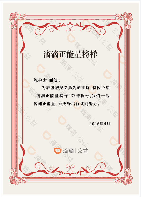 同时,滴滴公益正式授予陈金太“滴滴正能量榜样”称号,并通过“滴滴正能量在路上公益专项计划”,为其发放1000元现金奖励,致敬这份深夜里的凡人善举。