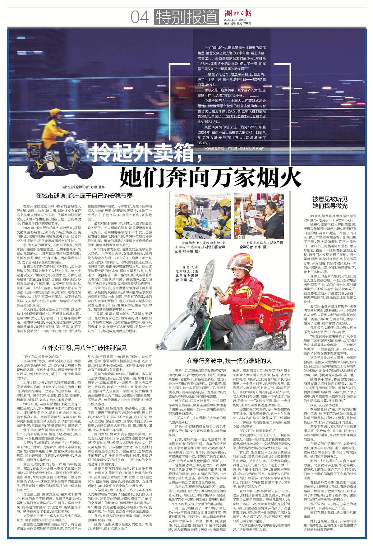 4月22日,本报刊发《拎起外卖箱,她们奔向万家烟火》,记录近年来越来越多女性加入外卖骑手队伍的现象。华中科技大学社会学院副教授王彦蓉认为,这一变化不仅是个人选择的结果,更折射出中国职业结构正在经历的深刻转型。