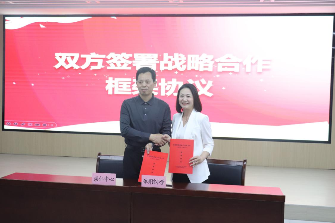 最后,崇仁中心与体育馆小学共同签署合作协议,双方以深化体教融合、推动体育事业与基础教育高质量发展为核心,充分发挥各自资源优势,构建普及与提高相结合、训练与教学相衔接的一体化育人模式,大力弘扬冠军文化,共同打造体教融合示范样板。