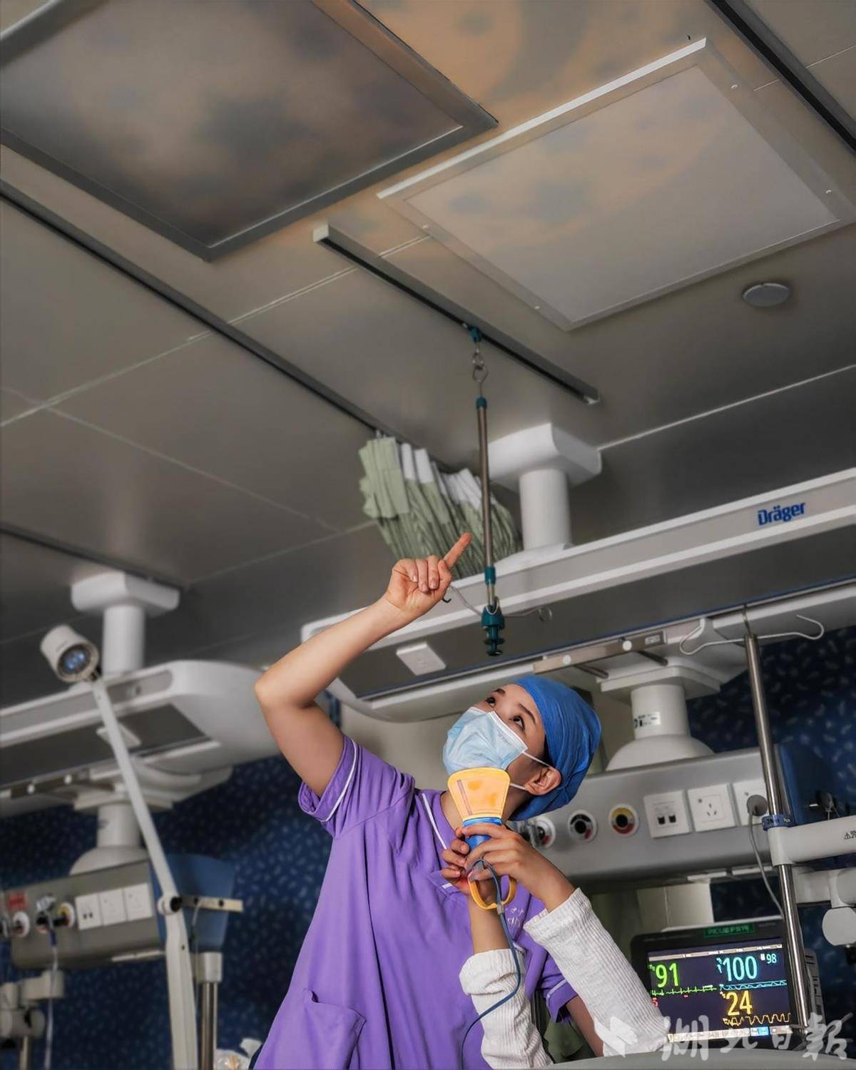 “孩子需要的不只是医疗操作,还有心理上的支撑。”杨怡是两个孩子的妈妈,平时就很注意了解孩子的喜好。在PICU,她主动当起“临时妈妈”,把病房改造成“太空舱”:呼吸机是“能量补给站”,监护仪是“星际导航仪”,吸痰和穿刺都变成一场“太空探险”。操作前,她蹲下来用“游戏闯关”的方式讲给玟玟听;治疗时,给玟玟戴上VR眼镜,仿佛在太空遨游、看恐龙动画,疼痛感似乎也没那么难熬了。