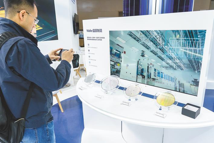 长飞先进展台,观众参观新型晶圆产品。(湖北日报全媒记者 魏铼 摄)