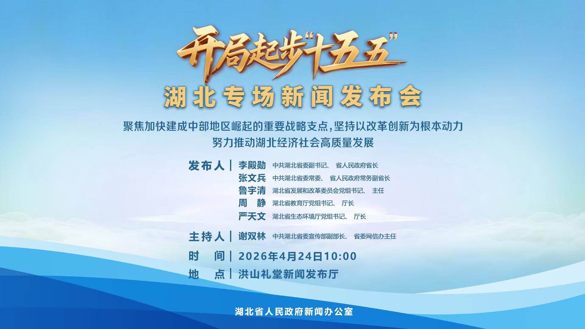 4月24日上午10:00,省政府新闻办公室将举行开局起步“十五五”湖北专场新闻发布会,邀请中共湖北省委副书记、省人民政府省长李殿勋,中共湖北省委常委、省人民政府常务副省长张文兵,湖北省发展和改革委员会党组书记、主任鲁宇清,湖北省教育厅党组书记、厅长周静,湖北省生态环境厅党组书记、厅长严天文围绕《湖北省国民经济和社会发展第十五个五年规划纲要》,全面介绍湖北聚焦加快建成中部地区崛起的重要战略支点,坚持以改革创新为根本动力,努力推动湖北经济社会高质量发展的相关情况,并回答记者提问。