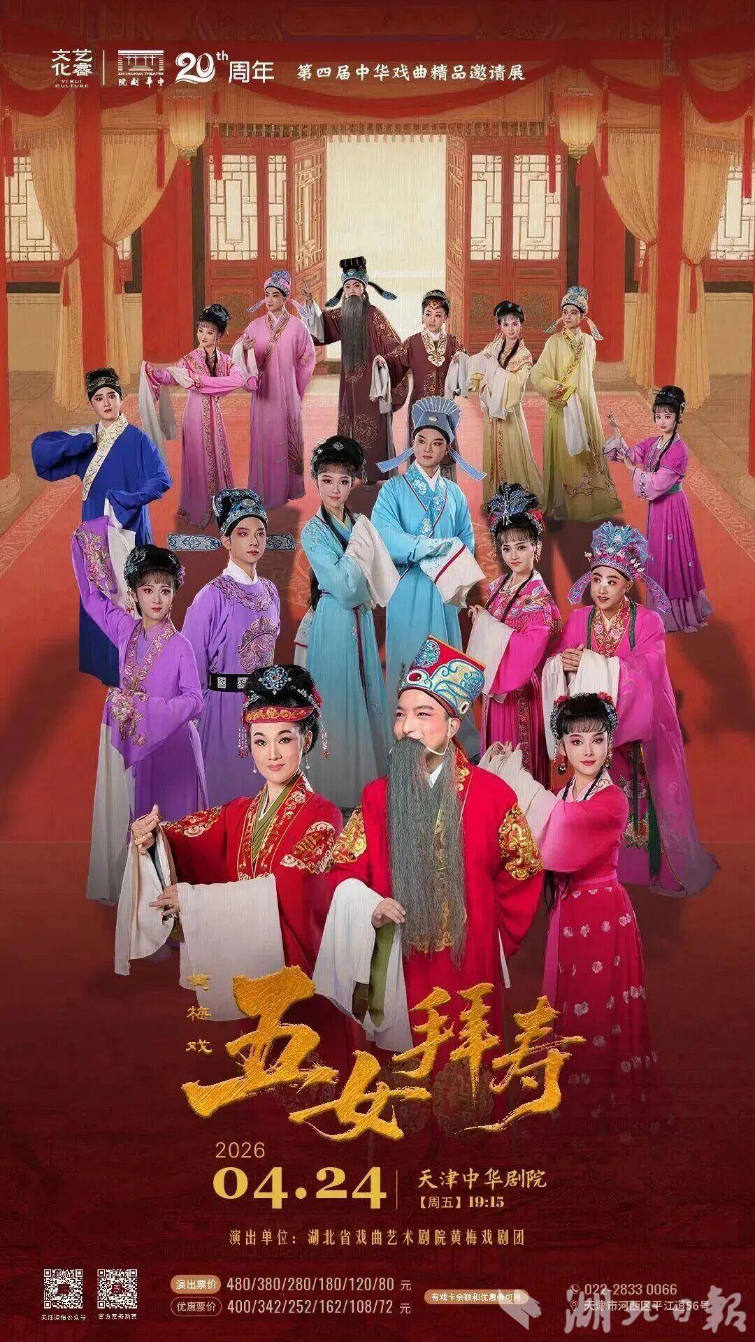 4月24日晚,鄂版黄梅戏《五女拜寿》将在天津中华剧院上演,由冯志刚、余银芳、杨雅岚、李洋等主演。该剧围绕明朝户部侍郎杨继康一家的官场沉浮展开———杨继康六十寿诞之际,众女儿、女婿奉厚礼进京拜寿,三女杨三春与三女婿邹应龙因贫寒被赶出杨府;后杨继康得罪权臣严嵩被削职抄家,唯有三女收留二老。直至三女婿邹应龙出仕朝堂,斗倒严嵩,杨家冤案方得昭雪。寿宴如同一面镜子,照出世态炎凉与真情可贵。全剧剧情起伏,扣人心弦。