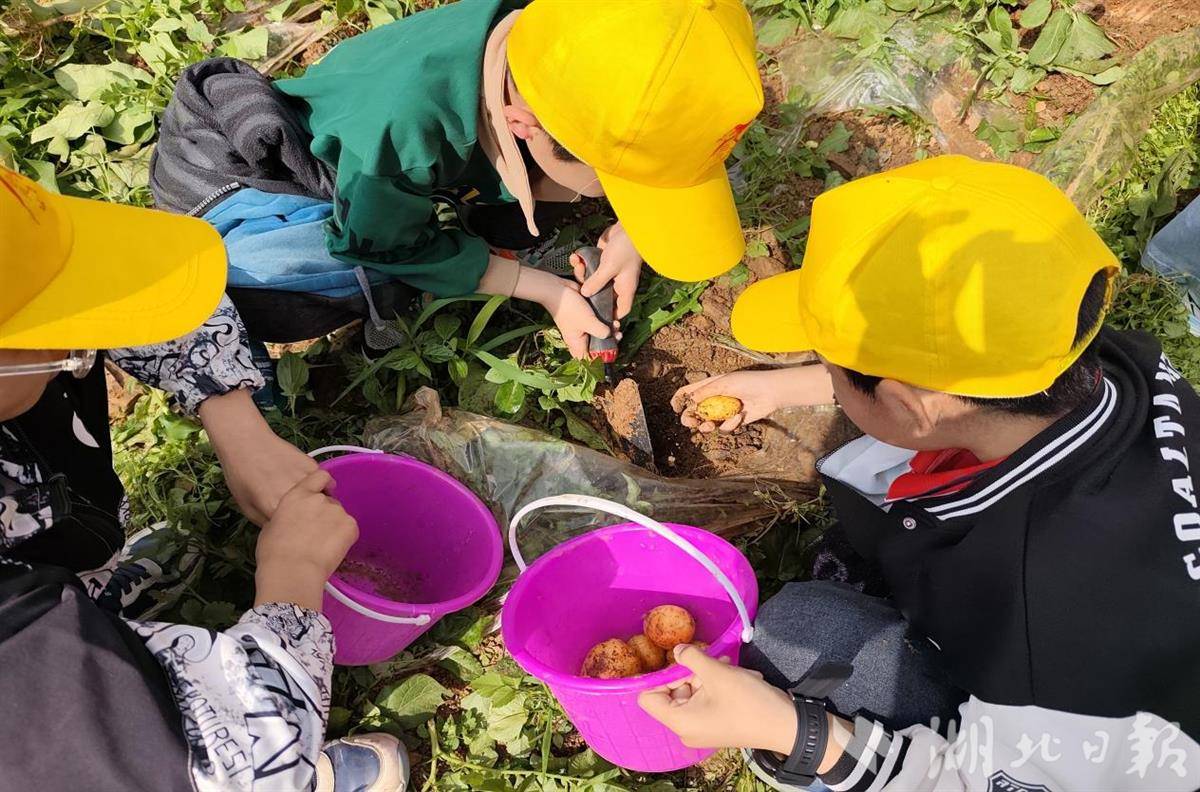 李白纪念馆内,丰富的实物展陈与详实的史料记载,生动勾勒出李白在安陆的生活轨迹与创作历程,学生们驻足凝思,仿佛与诗仙进行一场跨时空对话;在翰林湖劳动基地,打糍粑、挖土豆、炸薯条等农事体验热火朝天,同学们挽袖劳作,在出力流汗中体会收获的喜悦,感悟劳动之美。