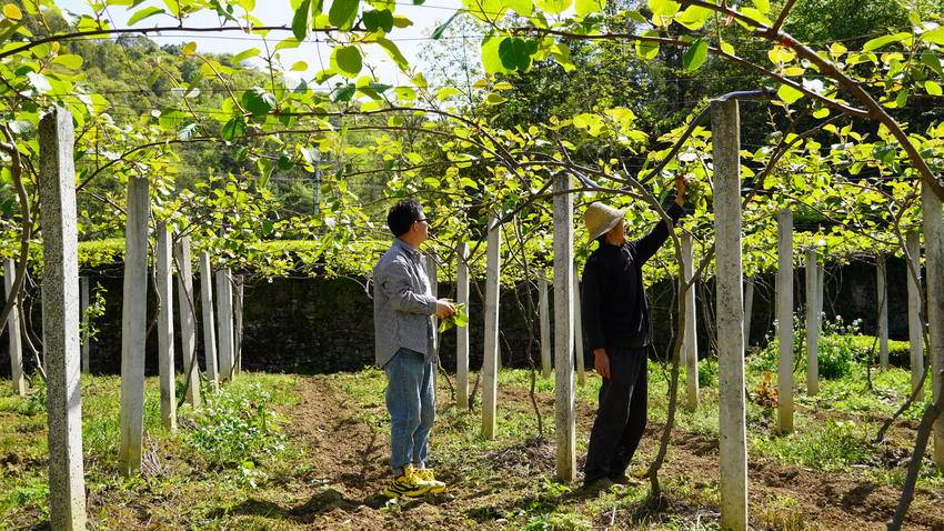 在潼泉村连片的猕猴桃果园里,新梢萌发,绿意盎然。村民们穿梭在藤蔓之间,仔细抹去弱芽、密芽、重叠芽和背下芽,科学保留健壮结果枝,确保养分集中供给,优化树体通风透光条件。大家分工协作、细致操作,田间一派井然有序的劳作景象。