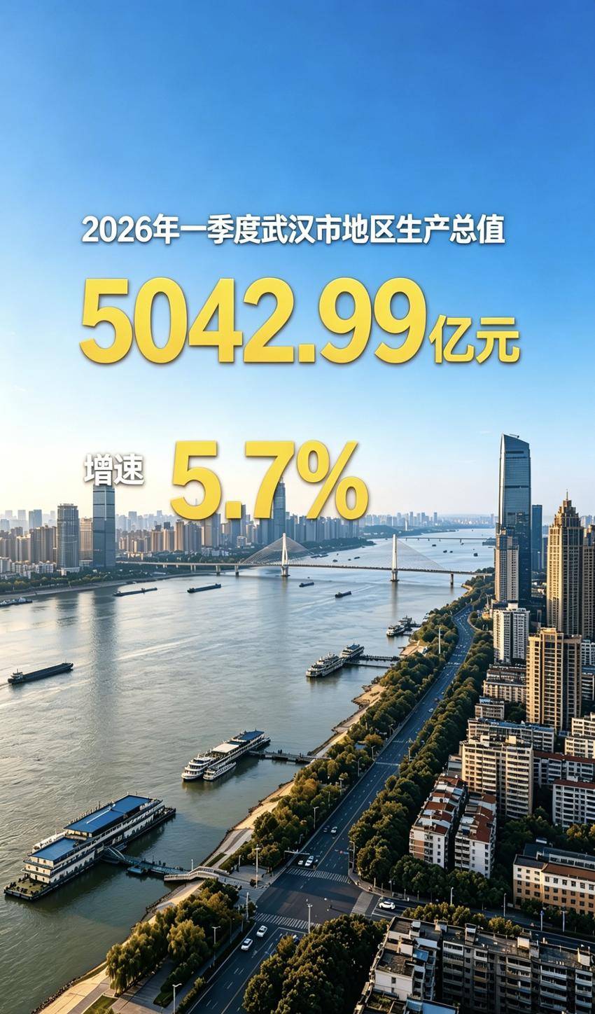 根据湖北省市州生产总值统一核算结果,初步核算,一季度全市地区生产总值(GDP)5042.99亿元,按不变价格计算,同比增长5.7%。分产业看,第一产业增加值76.28亿元,增长4.3%;第二产业增加值1781.30亿元,增长8.2%;第三产业增加值3185.41亿元,增长4.4%。