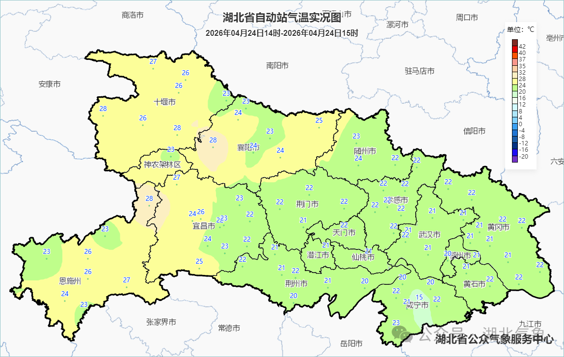 4月26日8时至27日8时,鄂西南多云转小到中雨,局地大雨并伴有雷电;鄂西北、江汉平原西部多云转阵雨或雷阵雨;其他地区晴天转多云。最高气温27~33℃,最低气温15~20℃,偏南风2到3级、阵风4到5级。