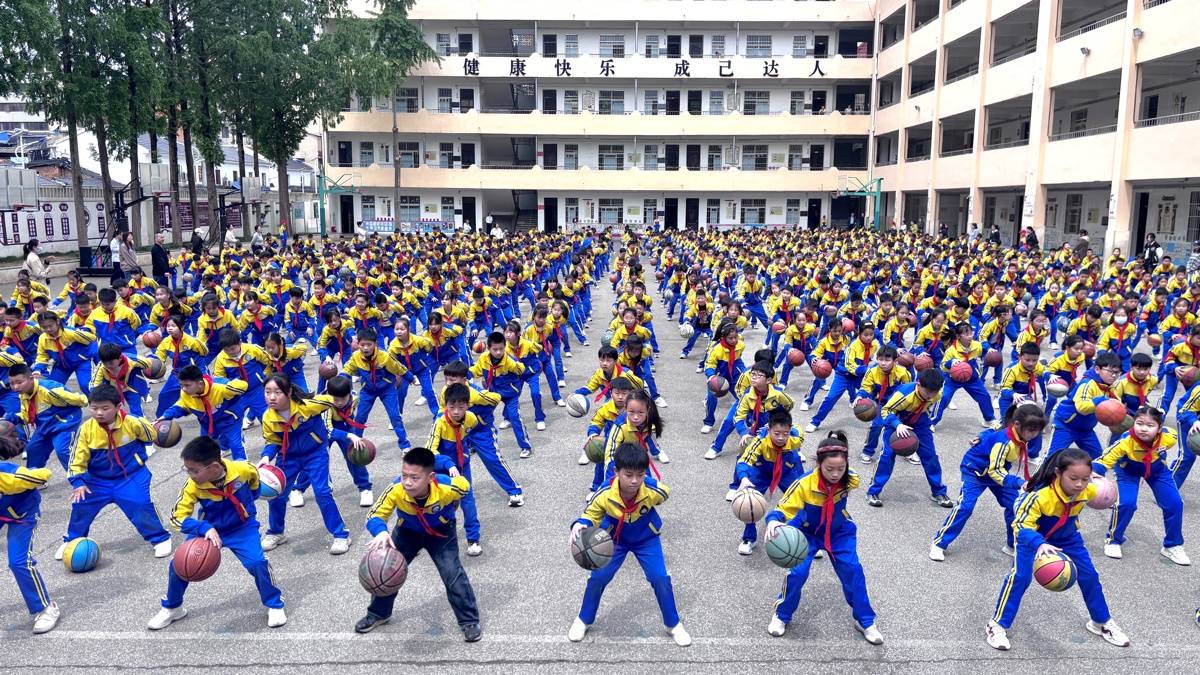 4月23日,枣阳市第一实验小学教联体小南街校区大课间,学生们正在进行篮球训练。