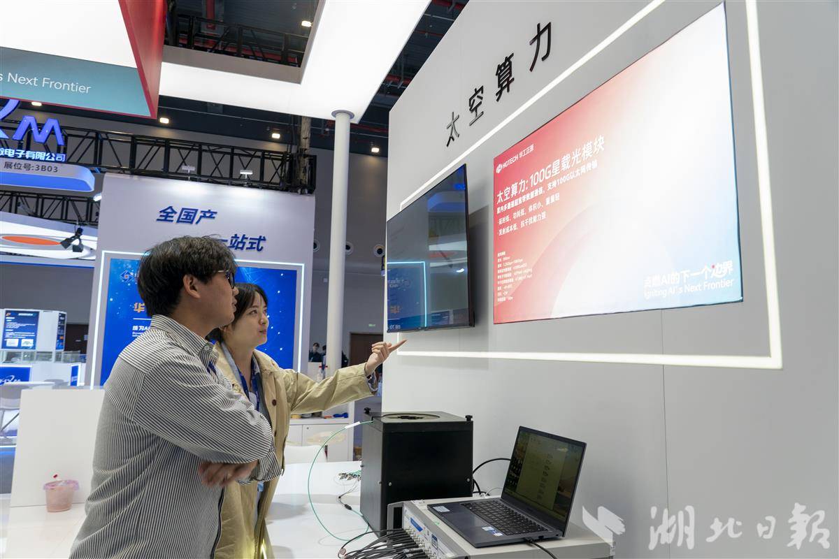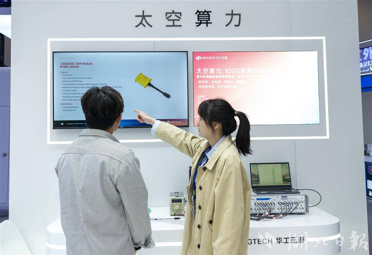 华工正源展台上的100G星载光模块,成为太空算力的关键支撑。