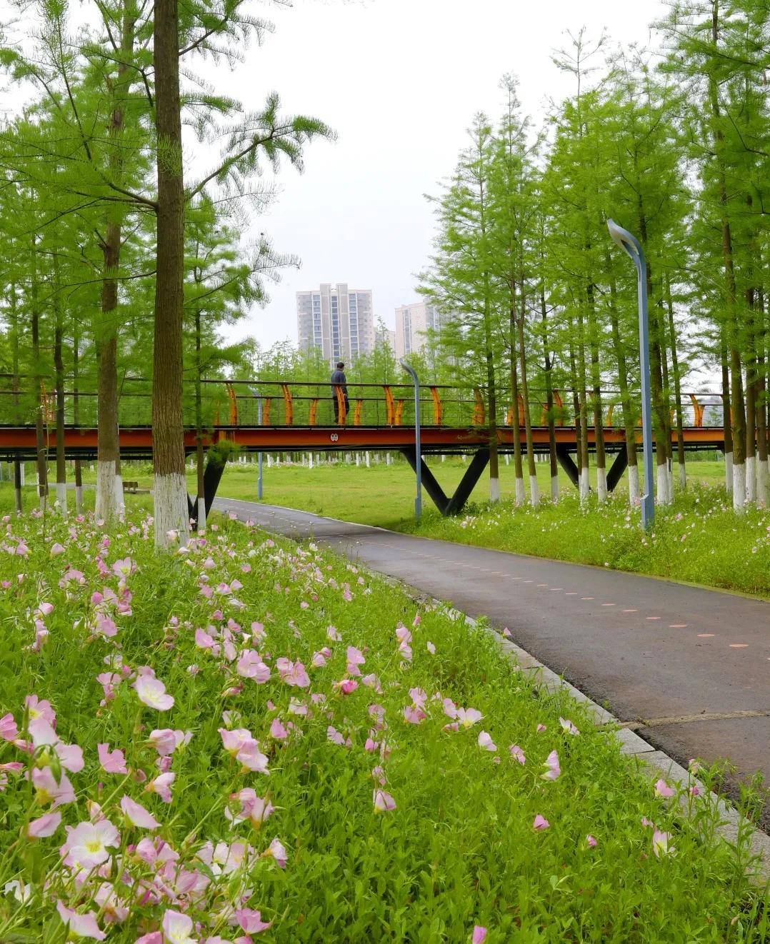 月季看了,不妨再到江边换换口味。洪山江滩的美丽月见草正值盛花期,粉红小花连绵成片,在江风中轻轻摇曳,温柔又治愈。推荐打卡荻海栈桥和江谣营地,橘黄色的杨泗港长江大桥下,大片粉红花朵铺展开来,随手一拍都是大片。江风吹拂,花香弥漫,找个周末来这里露营、拍照、发呆,把一整个春天的浪漫都带回家。