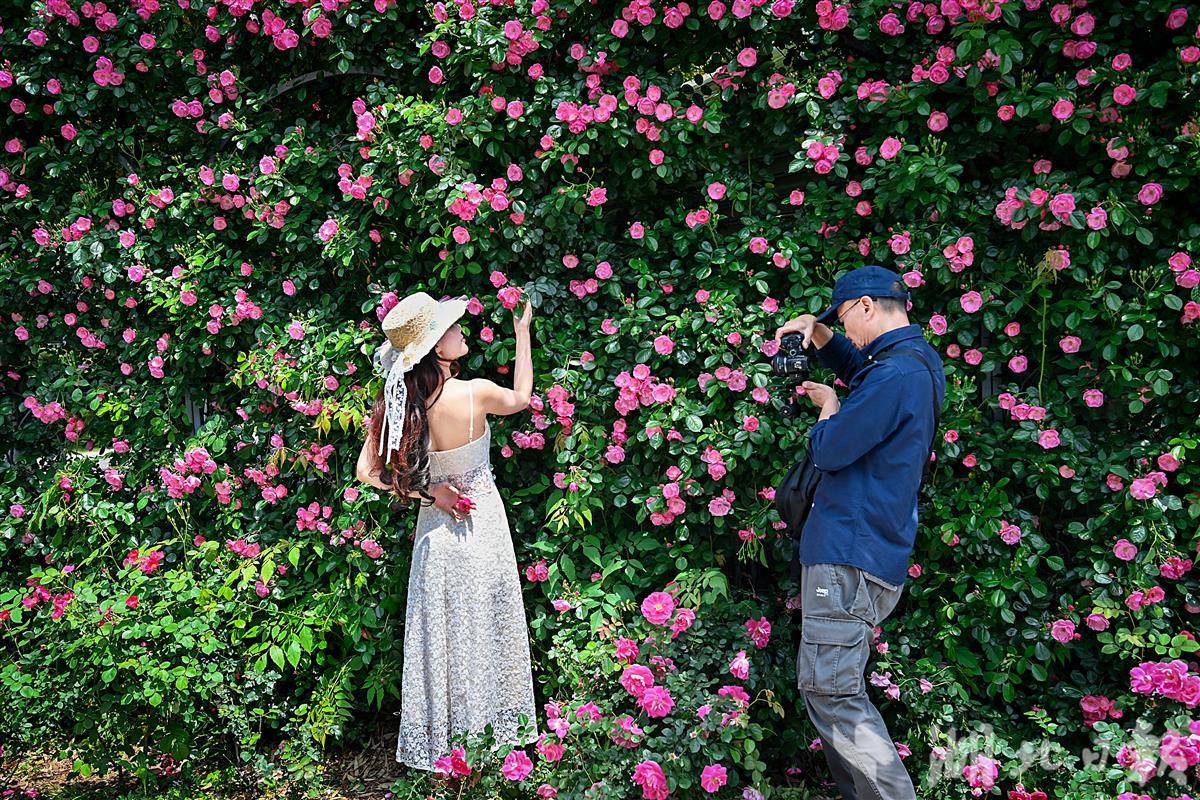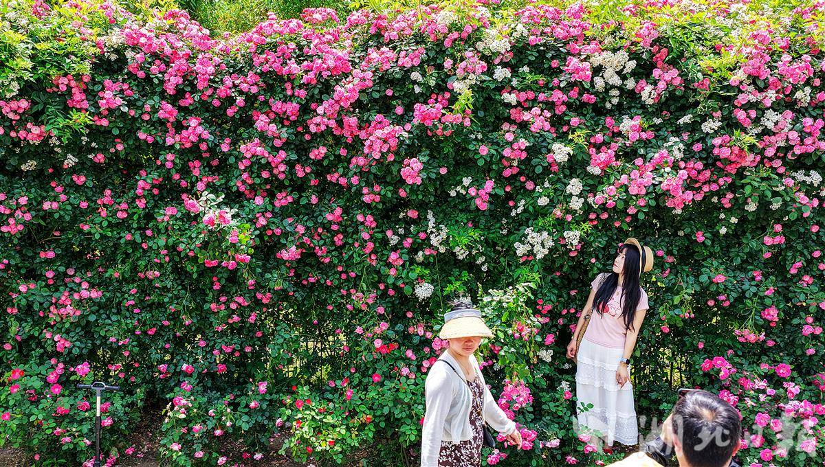 4月25日,武汉市杨春湖湿地公园的蔷薇花墙、月季花园等近百个品种的月季花、蔷薇花绽放,将整个公园装点成一片色彩斑斓的花海,吸引了众多游人前来赏花。特别是大面积的蔷薇花盛开,把高约3米的墙装扮成粉色,使蔷薇花墙呈现出几分浪漫色彩。(湖北日报全媒记者 朱熙勇 摄)