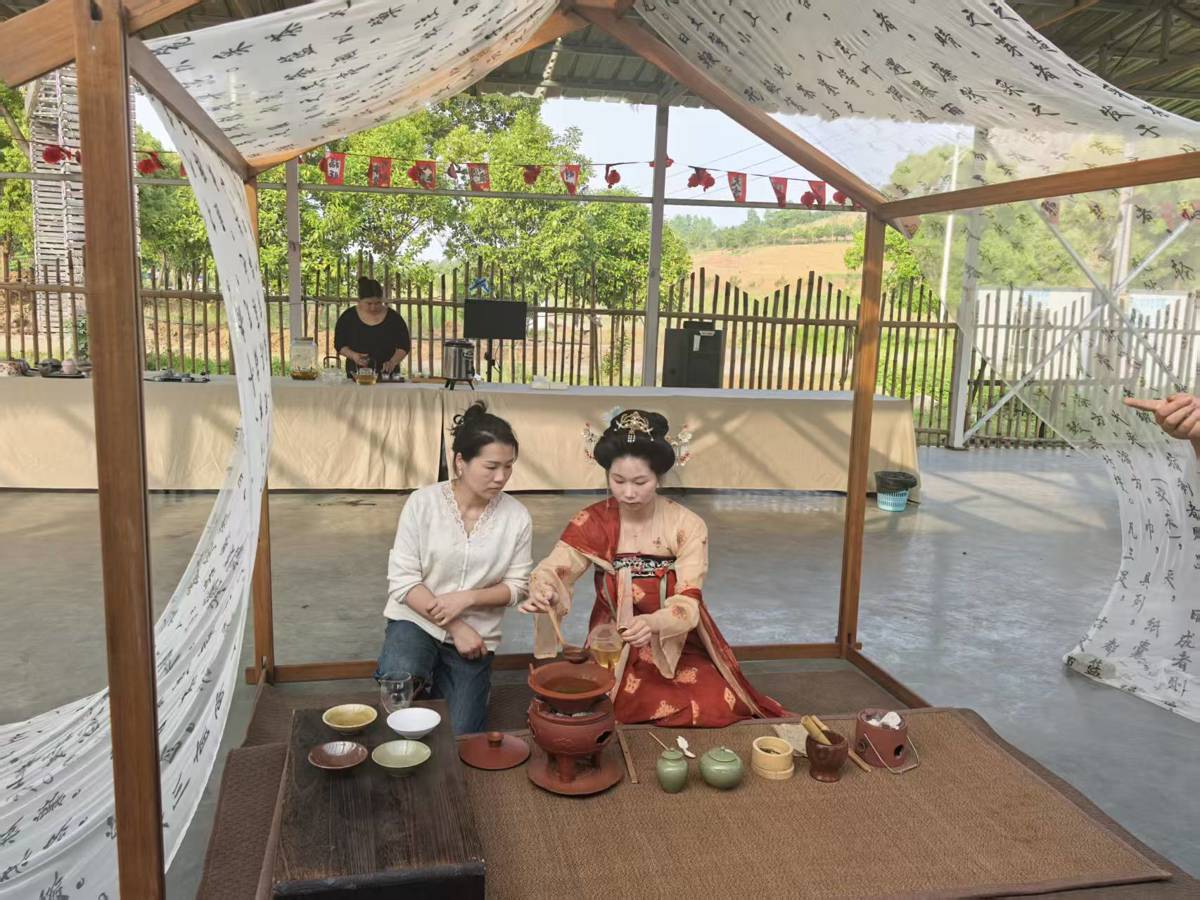 车子刚开进陆子生态茶园,漫山绿意扑面而来。更吸引人的,是一场唐代煎茶表演——茶艺师身着古装,碾茶、煮水、分汤,一招一式,古韵悠长。