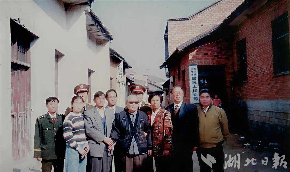 1996年春天,汪荣华(前排戴墨镜者)在县镇领导陪同下,走进石头咀镇老街,在街口留影。 (通讯员 朱祥 供图)