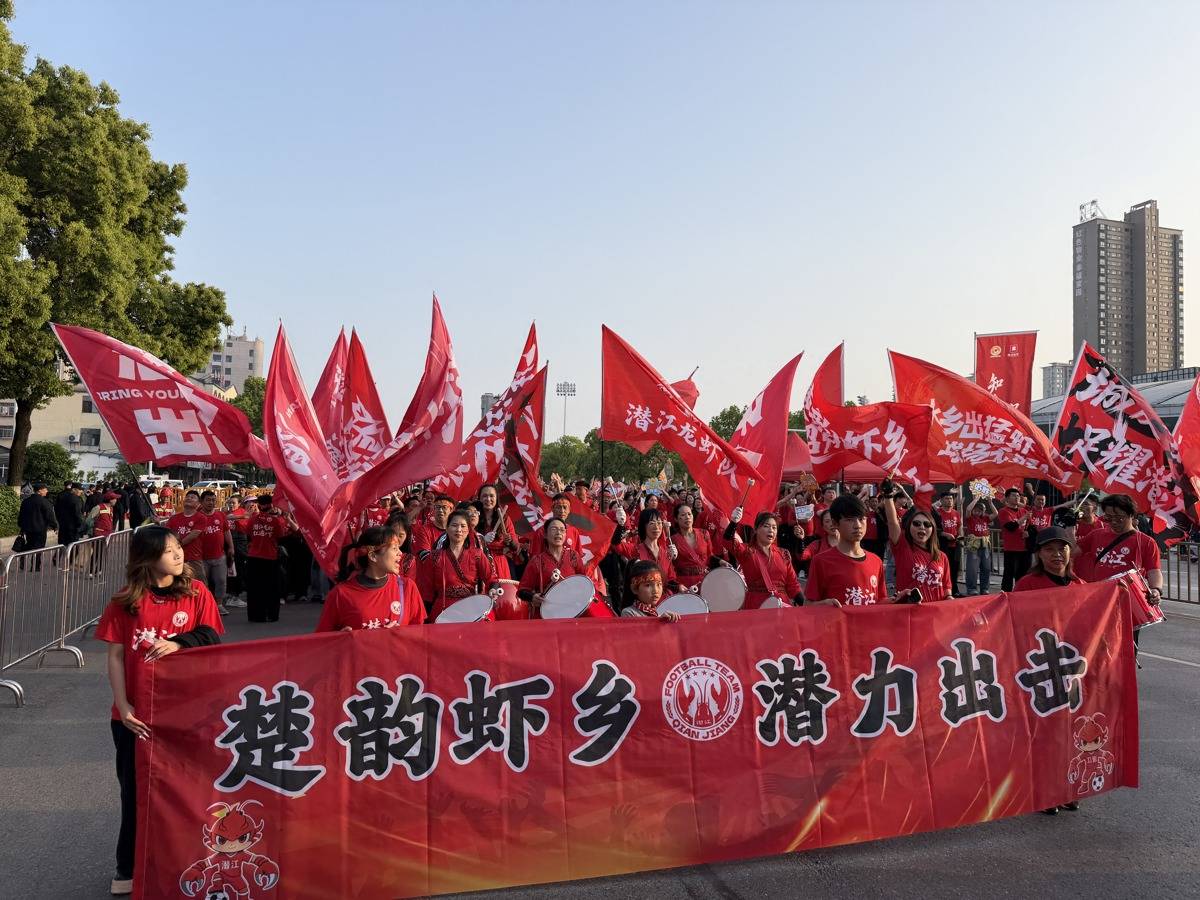 八大赛区的场外活动,更让球迷津津乐道。各地将地域文化、特色民俗融入赛事氛围,打造出极具荆楚特色的足球嘉年华。襄阳赛区延续首轮高光,8匹“西楚霸王”同款战马现场策马出征,啦啦队激情热舞,浓厚的历史文化氛围与足球热情相融;恩施赛区球迷喊出“土豆不装蒜,上场就开干”的口号,准备土家摔碗酒助威,尽显少数民族的豪迈与热情;潜江赛区首秀,组建300人演艺团队,全场共跳龙虾舞,无人机光影秀点亮夜空,将龙虾之乡的特色尽展无遗,站在自家阳台的“挂票”观众边吃烧烤边加油观赛,“烟火气”十足;十堰赛区借力武当文化,以“高人助阵”为球队加油,荆州球迷则身着战国袍远征,用传统文化为球队助威。