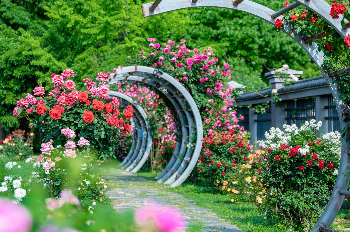 藤本月季攀援在白色花架和青砖墙上,形成暗香浮动的浪漫长廊;地被月季与微型月季在花圃中密植,打造出色彩艳丽、步步皆景的花毯;树状月季树冠丰满,花大色艳,形如花树,绚烂夺目。园内更遍布茶香月季与香水月季,花开时节芬芳满径,视觉与嗅觉享受双重满足。