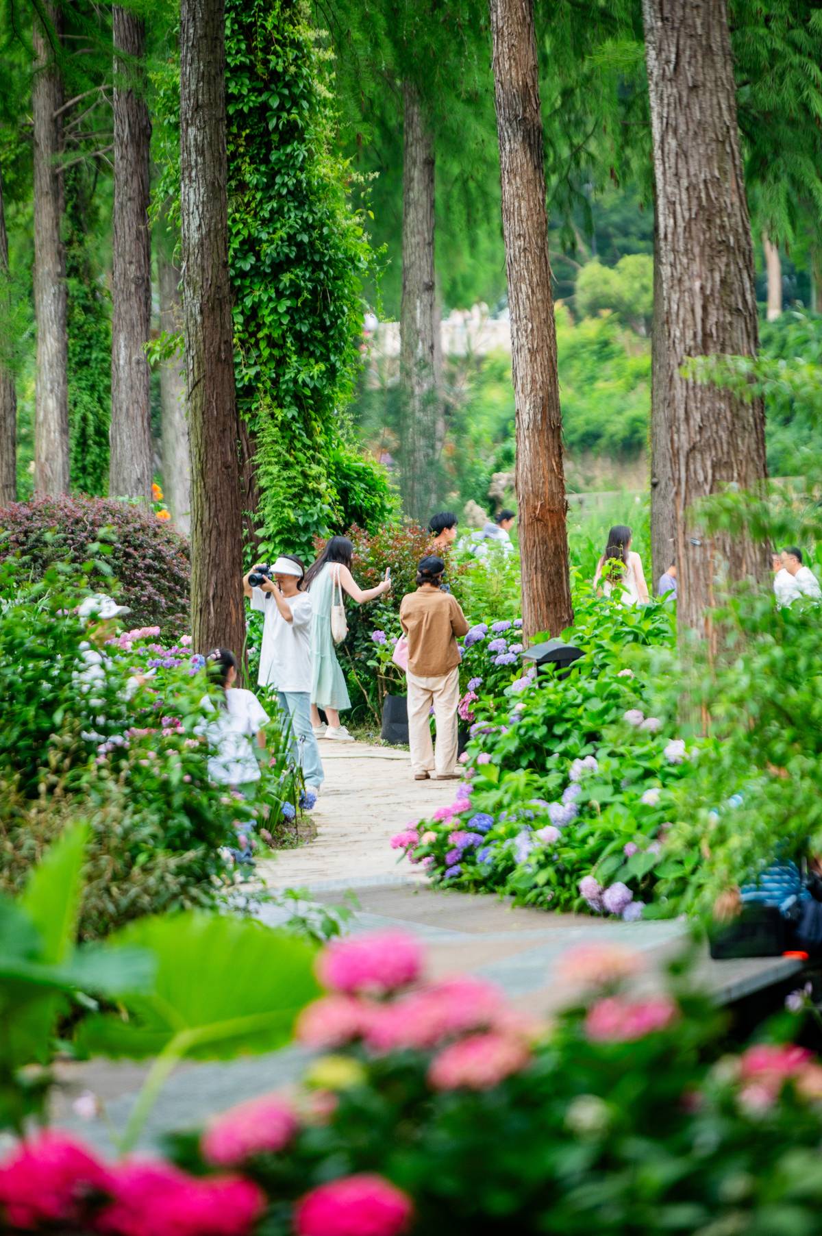 主展区设于绿野花田和中央花境大道对岸的水杉林,并通过精心设计呈现多重景致。绿野花田展区分为“启程之境”“仙踪花径”“星梦花坞”及“童话邂逅”四个主题景点。“仙踪花径”由蓝紫色的“无尽夏”与粉嫩的“花手鞠”等绣球夹道两边,营造浪漫漫步体验;“星梦花坞”以被藤蔓与绣球包裹的童话木屋为核心,成为梦幻打卡点;“童话邂逅”则融入多个童话场景,用绣球打造出奇幻治愈的精灵花园,让游客在繁花中感受静谧与美好。中央花境大道对岸的杉林大道上,2000盆大花绣球沿水杉林道蜿蜒陈列,挺拔杉树的绿荫与绚丽绣球相互映衬,形成一条“林下生花、一步一景”的诗意花廊。中央花境大道上红房子处,各色绣球与大花飞燕草、毛地黄、狼尾草等植物错落搭配,并与原有的铁线莲、月季等当季花卉融合,构成一幅层次丰富、野趣横生的“庭院式”花境。