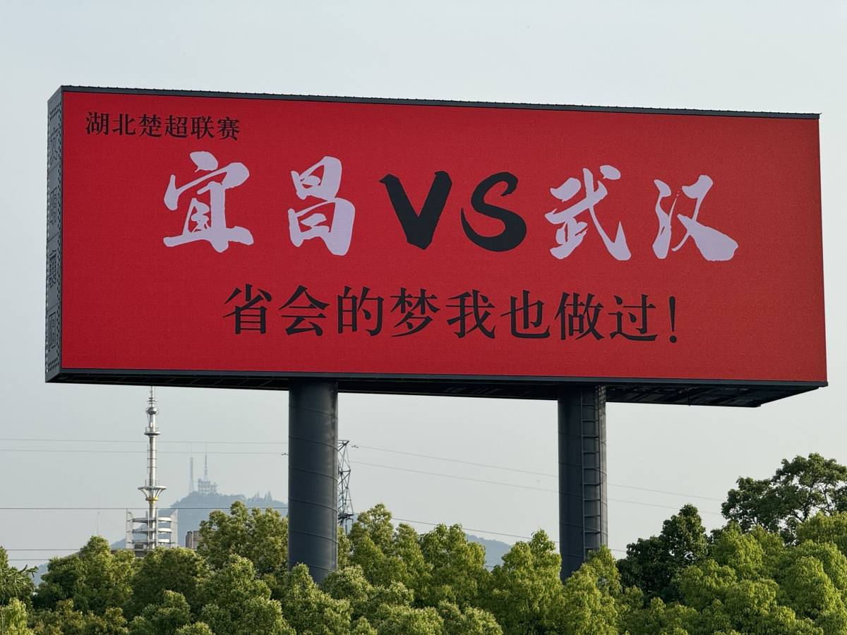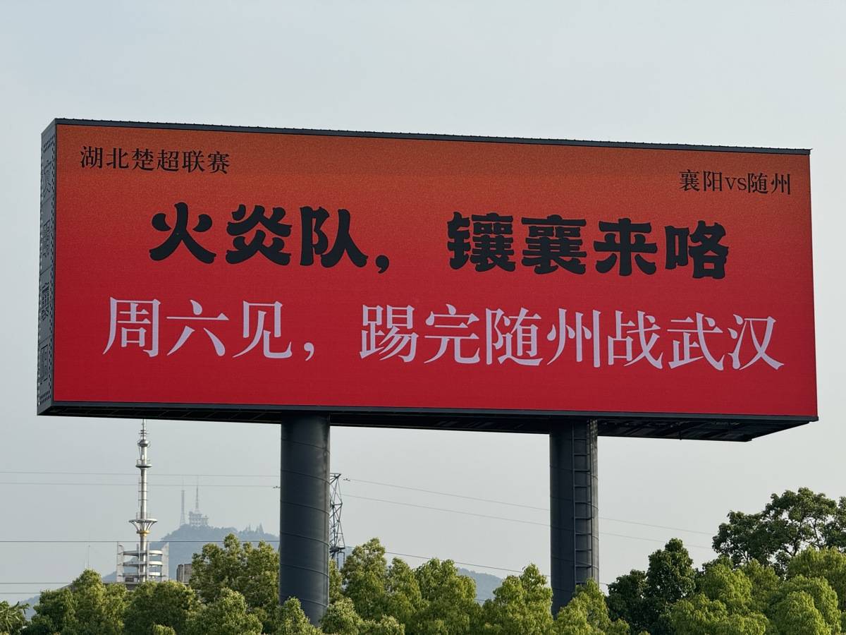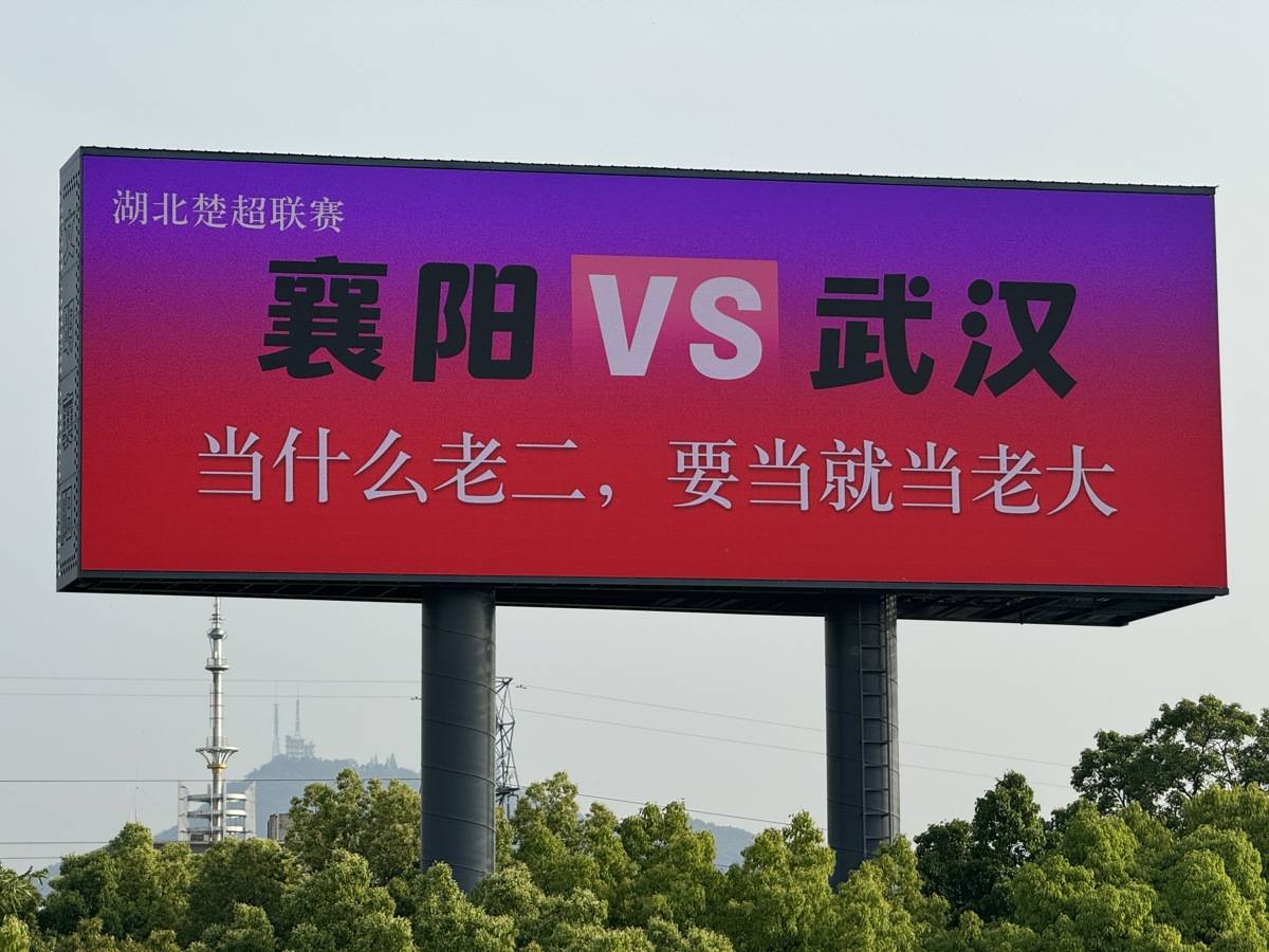 正值“楚超”联赛期间,襄阳球迷用这块大屏直接向武汉喊话,毫不遮掩争胜决心。有现场市民感叹:“襄阳彻底不装了!”