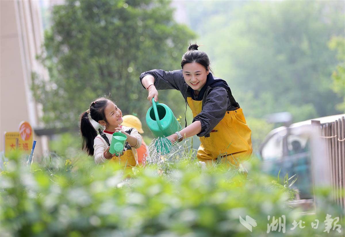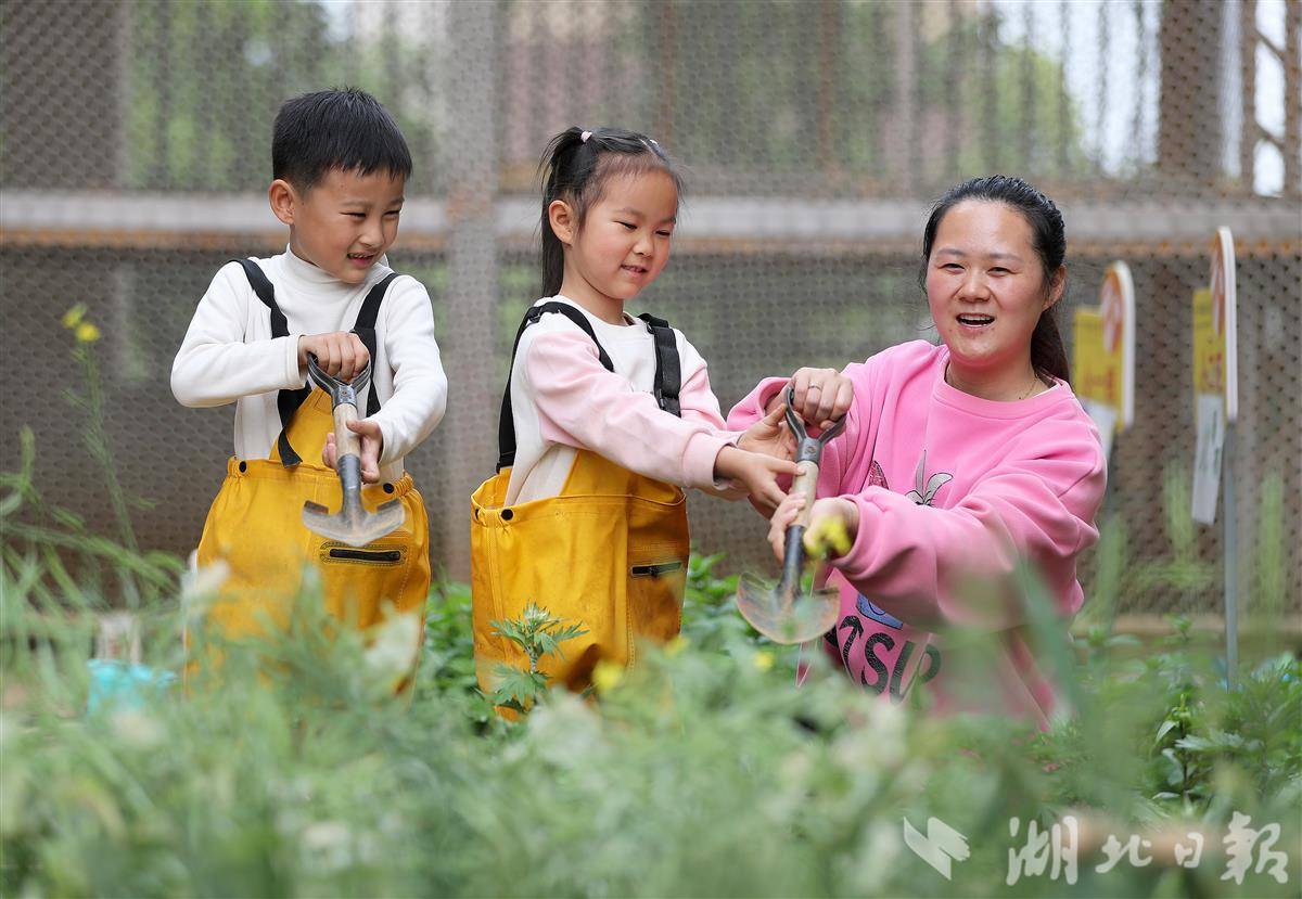 4月24日,在荆门市东宝区长宁实验幼儿园种植园里,孩子们在老师带领下体验翻土、播种等田间劳作的乐趣。