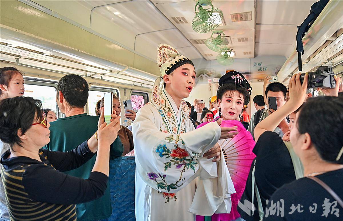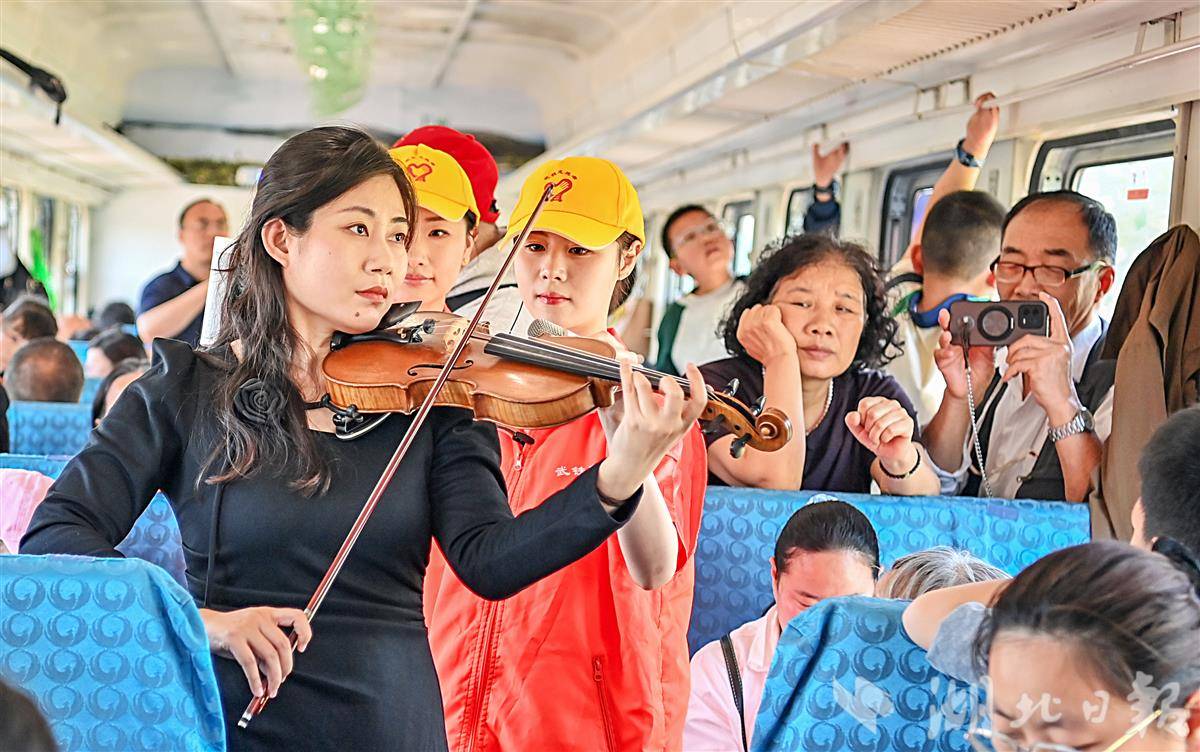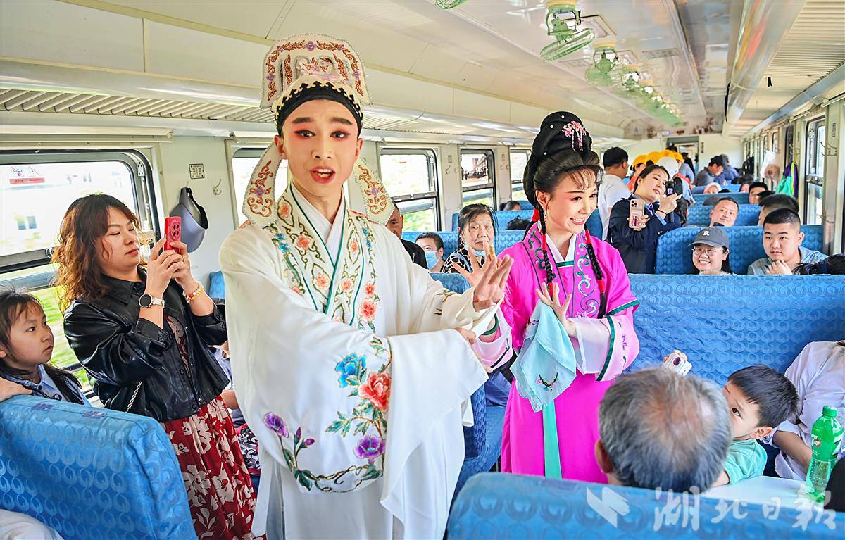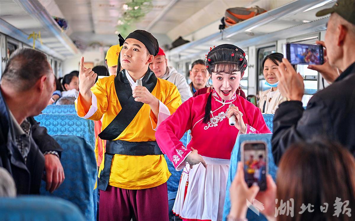 4月26日上午,湖北省演艺集团42名演职人员分为3队,登乘“武昌至武昌”5856次普速环线列车,逐节车厢表演节目。窗外风光与车厢艺韵交相辉映,艺术家们带着“压箱底”的绝活儿走进车厢,旅客们也纷纷拿出手机定格旅途美好瞬间。