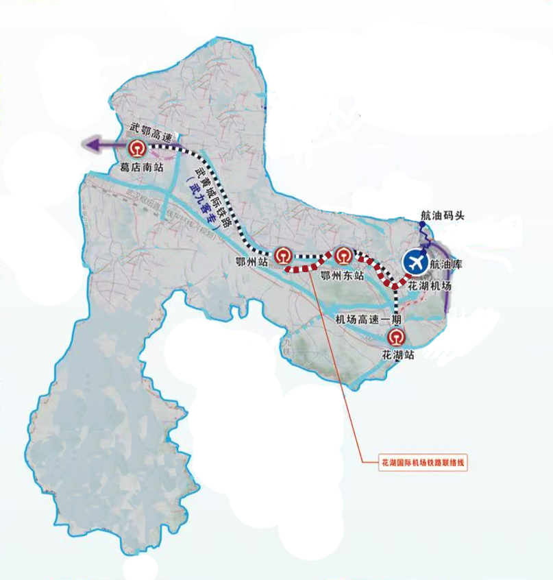 总投资22.69亿元的花湖国际机场铁路联络线线路全长22.022公里,西端于鄂州站接轨武九铁路,连通全国铁路货运网络,东端在花湖国际机场停机坪南侧设货运站,实现空铁联运,是湖北构建铁水公空多式联运体系的关键工程。
