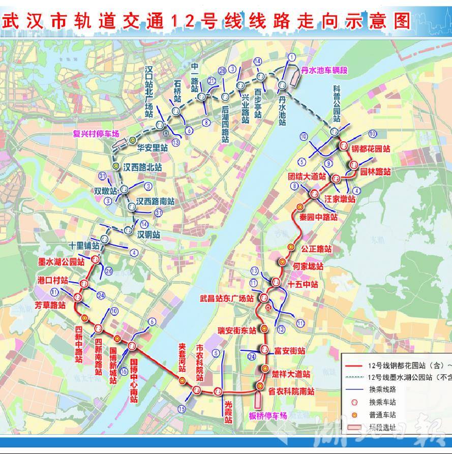 武汉地铁12号线计划分两期开通,一期工程由钢都花园站至墨水湖公园站,长约35.32公里,设车站23座,已经具备开通条件。二期工程由十里铺站至科普公园站,预计今年国庆节具备开通条件。