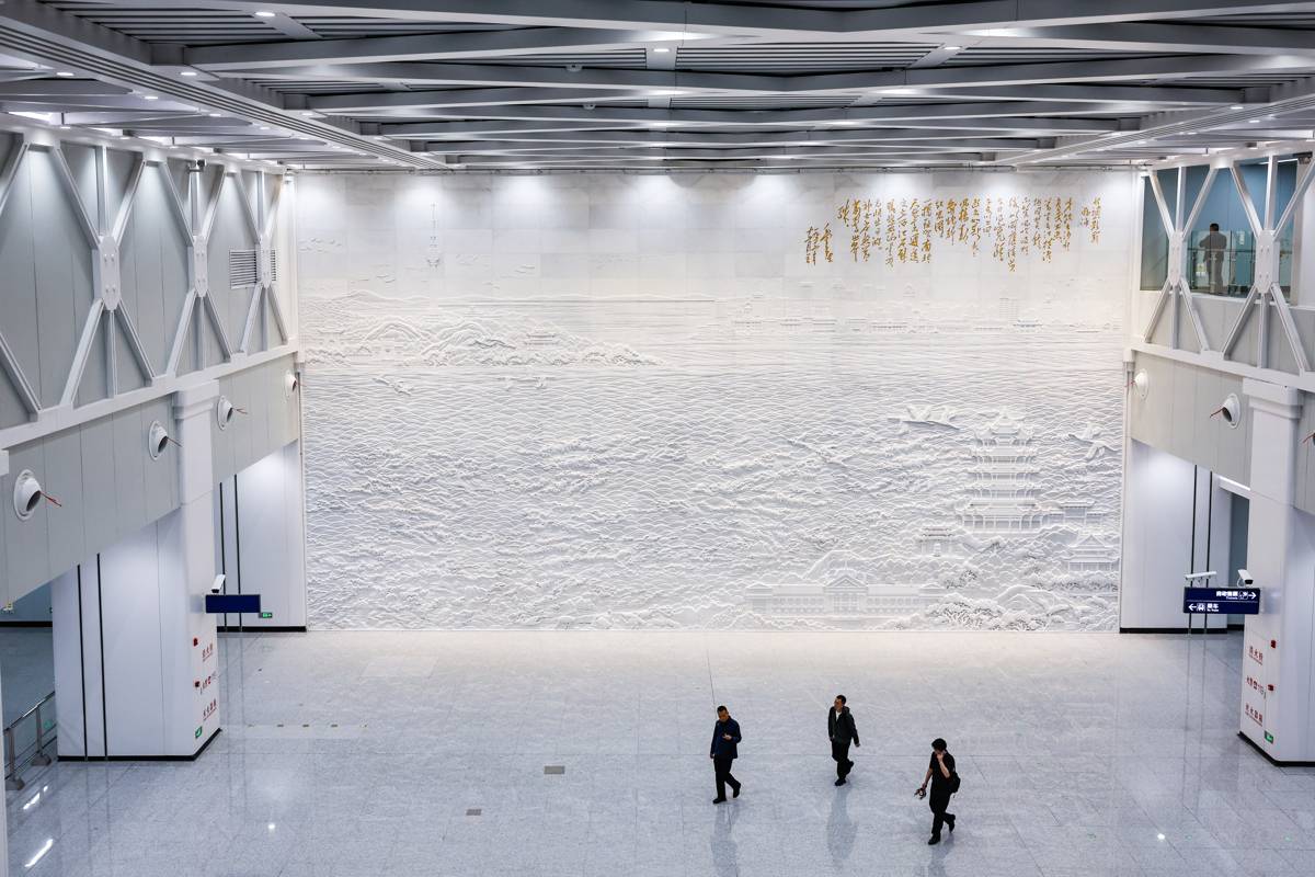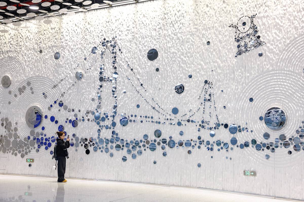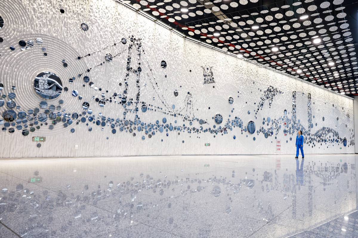 国博中心南站以“博览万千”为主题,镜面艺术墙呈现长江韵律。