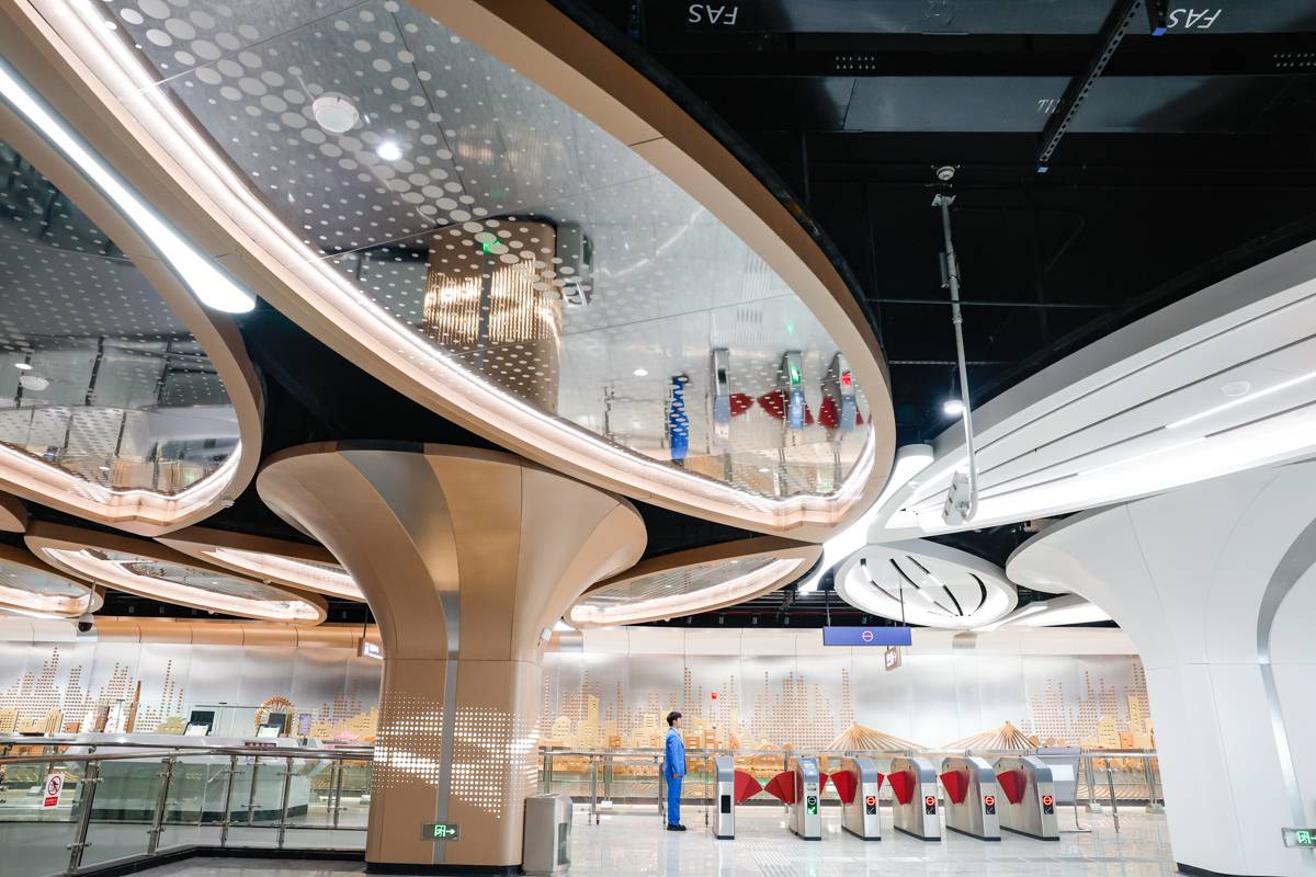 公正路站主打暖金色调,融合自然灵韵与商业活力。