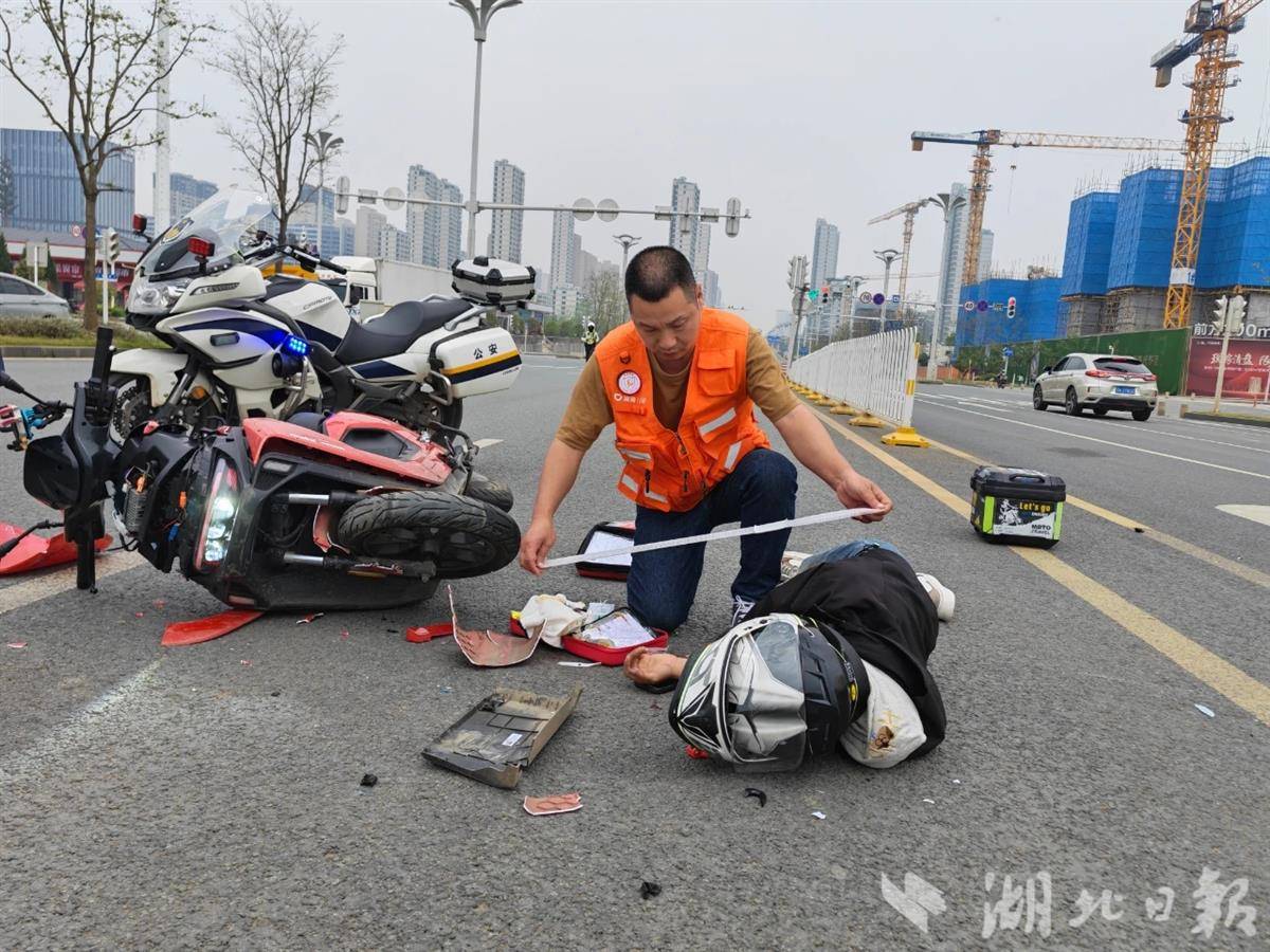 4月7日中午1时,武汉高新二路与松涛路交叉口。一辆中型面包车掉头时,后方电动自行车来不及刹车,骑车人被撞飞昏迷。生死关头,一辆路过的白色网约车稳稳停下,司机叶艳强从后备箱取出AED和急救包冲向伤者。半小时后,救护车抵达,伤者生命得以保全。