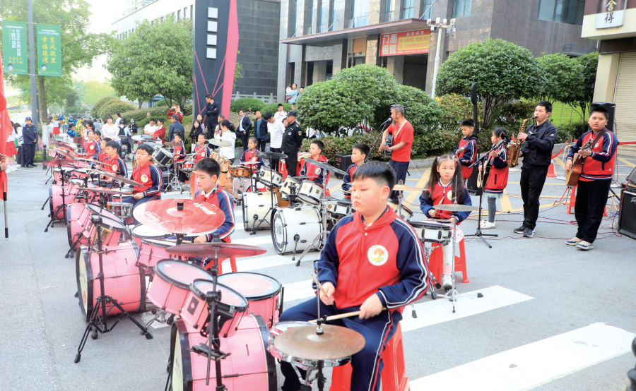 阳光小学的学生们用激昂的鼓点声为跑者加油。