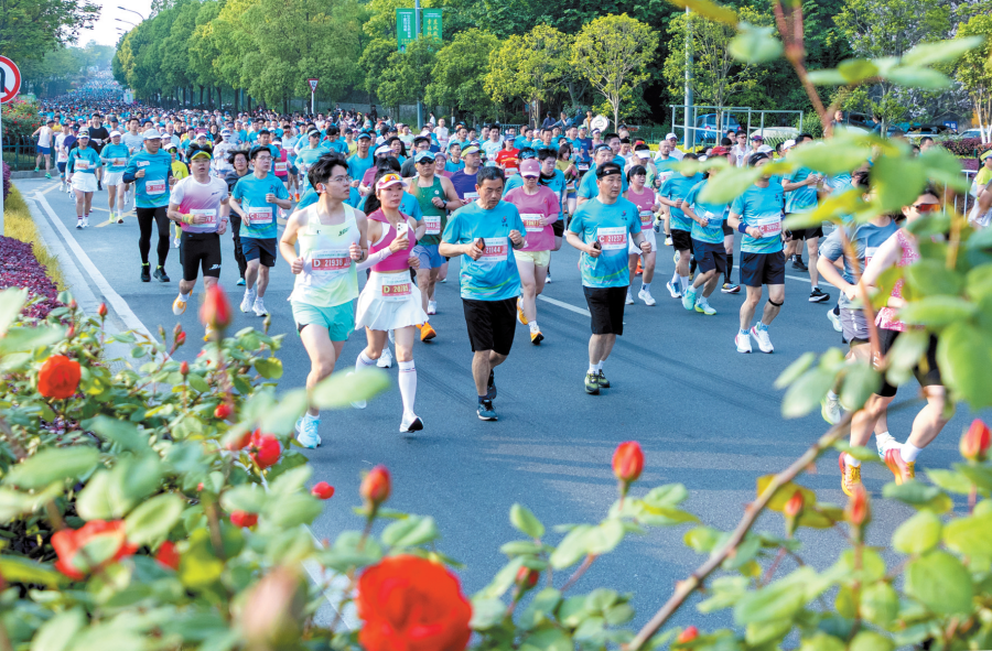 参赛选手迎着春风,在城市绿廊奔跑。记者 刘昆 摄