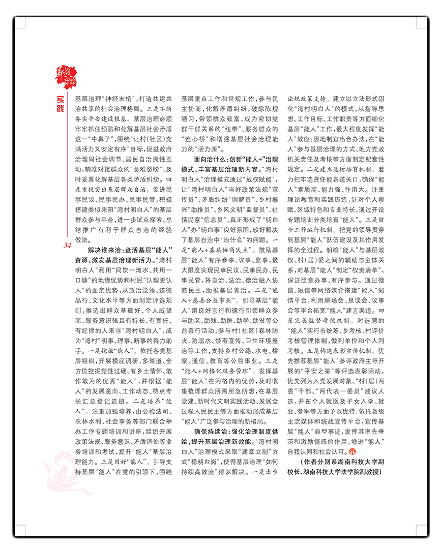 确保持续治:强化治理制度供给,提升基层治理新效能。“湾村明白人”治理模式采取“建章立制”方式“稳明白岗”,使得基层治理“如何持续高效治”得以解决。一是出台法规政策支持。建立以立法形式固化“湾村明白人”的模式,从指导思想、工作目标、工作职责等方面细化基层“能人”工作,最大程度发挥“能人”效应;因地制宜出台办法,在“能人”参与基层治理的方式、地方党政机关责任及考核等方面制定配套性规定。二是建立选树培育机制。着力把牢选贤任能各道关口,确保“能人”素质高、能力强、作用大。注重理论教育和实践历练,针对个人禀赋、区域特色和专业特长,通过开设专题培训分类培育“能人”。三是健全工作运行机制。把党的领导贯穿到基层“能人”队伍建设及其作用发挥的全过程。明确“能人”与基层政权、村(居)委之间的辅助与主体关系,对基层“能人”制定“权责清单”,保证照章办事、有序参与。通过微信、短信等网络媒介搭建“能人”知情平台,利用屋场会、恳谈会、议事会等平台拓宽“能人”建言渠道。四是完善监督考核机制。对选聘的“能人”实行市统筹、乡考核、村评价考核管理体制,做到单位和个人同考核。五是构建表彰宣传机制。优先推荐基层“能人”参评政府主导开展的“平安之星”等评选表彰活动,优先列为入党发展对象、“村(居)两委”干部、“两代表一委员”建议人选,并在个人就医及子女入学、就业、参军等方面予以优待;依托各级主流媒体和统战宣传平台,宣传基层“能人”典型事迹,发挥其率先垂范和激励情感的作用,增进“能人”自我认同和社会认可。(作者分别系湖南科技大学副校长、湖南科技大学法学院副教授)