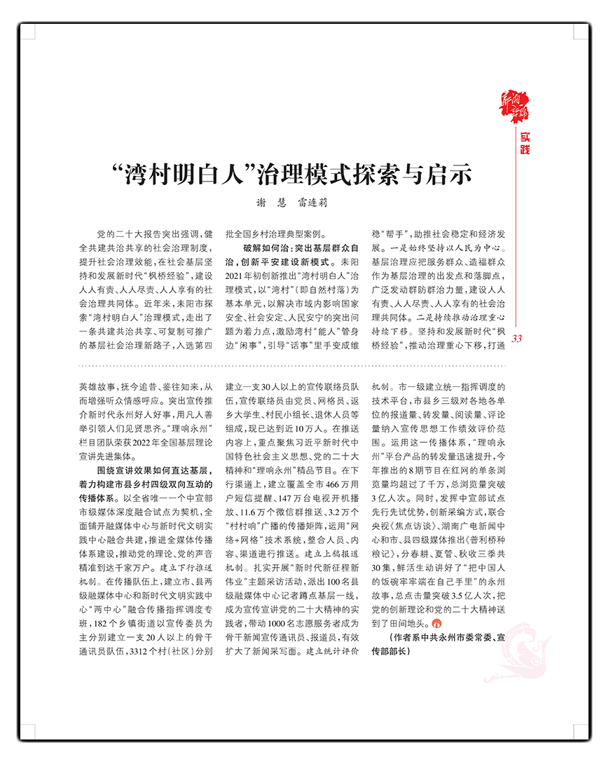 党的二十大报告突出强调,健全共建共治共享的社会治理制度,提升社会治理效能,在社会基层坚持和发展新时代“枫桥经验”,建设人人有责、人人尽责、人人享有的社会治理共同体。近年来,耒阳市探索“湾村明白人”治理模式,走出了一条共建共治共享、可复制可推广的基层社会治理新路子,入选第四批全国乡村治理典型案例。