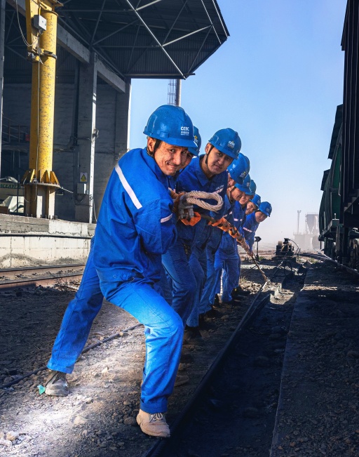 中国能建葛洲坝西里水泥项目哈籍职工挂牵引绳。(通讯员 汪全元 摄)