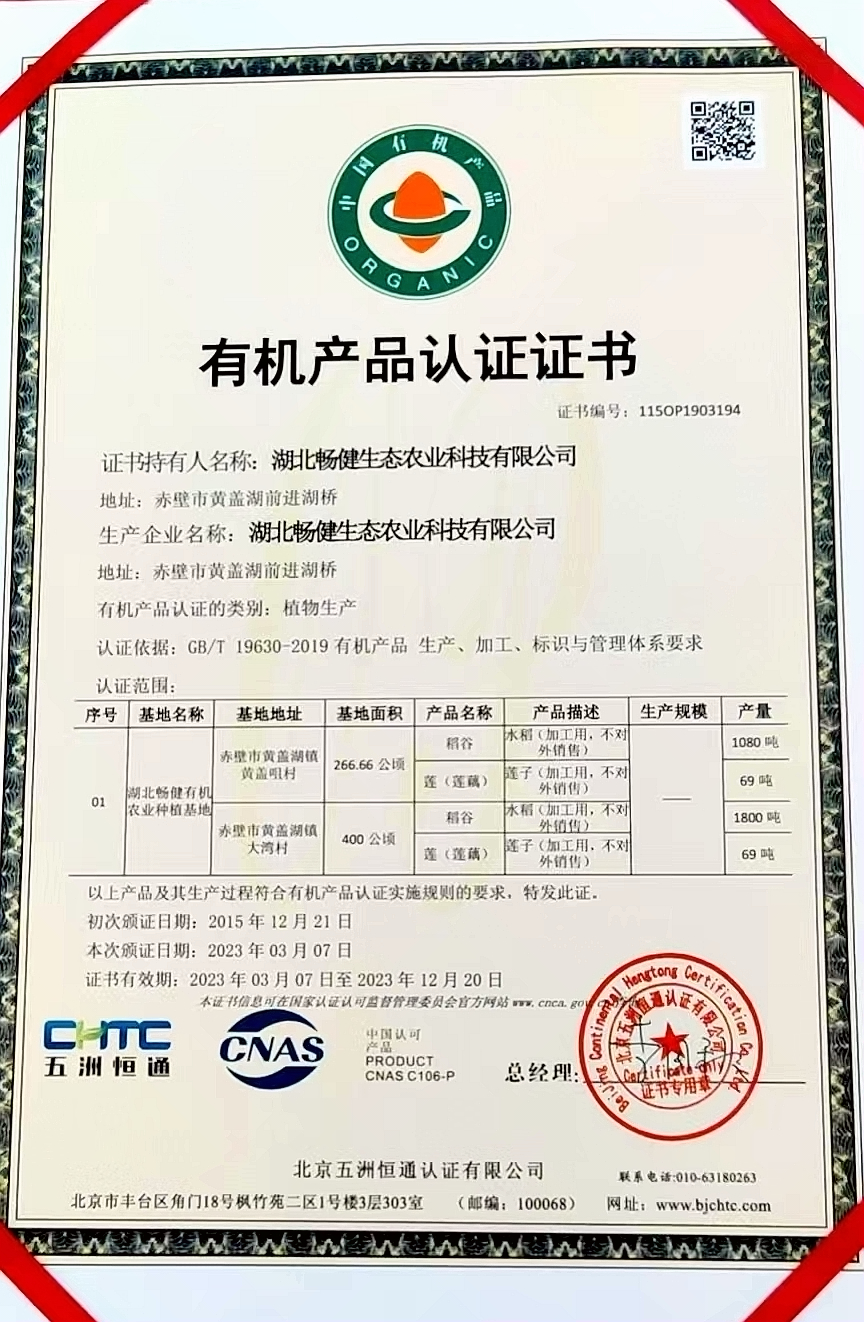 黄盖湖镇大部分区域是传统的水稻种植区,但过去农户家家户户分散种植,不好规范管理。湖北畅健生态农业科技有限公司入驻老河口村后,与赤壁市黄盖湖镇人民政府合作,在这里建设一个“不用转基因品种,不施化肥农药,不用化学添加剂”的万亩“中国国家有机认证”标准化基地,带动农户2210户,辐射面积达4万亩。