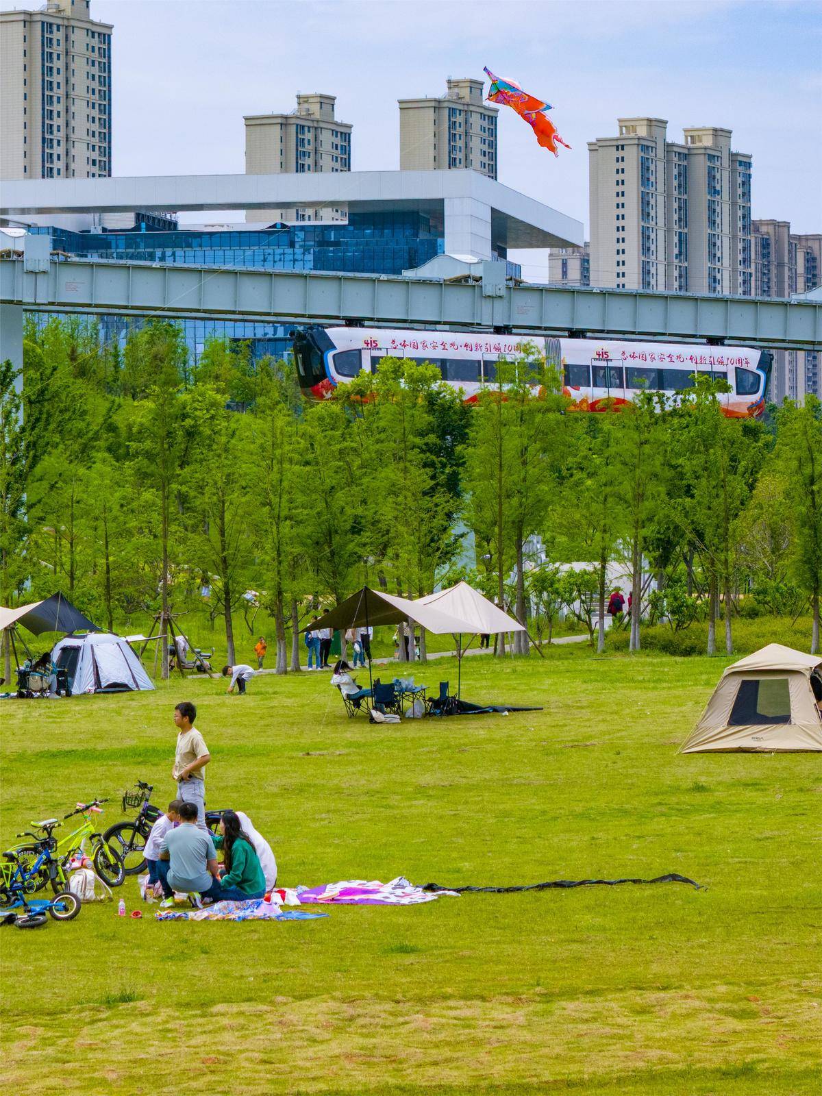 图为一列空轨列车驶过光谷中央生态大走廊。这条生态大走廊是连通大东湖流域和汤逊湖流域的主要廊道,在区域生态结构中具有重要地位。(湖北日报全媒记者 魏铼 摄)